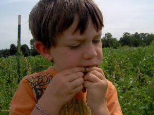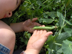>Our son, Cosmo has reached a certain level of expertise in the area of pea picking. At the age of 3 1/2 years old, he is a connoiseur of “the fat ones” and can shell and eat fresh peas for a minimum of two hours, while conducting a discourse on beneficial insects. He recently generously spared a moment of his time with me and allowed me to capture a glimpse of this young man, hard at work on his budding pea-eating career. Let’s go with him now—to the pea patch!