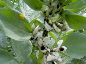 And, don’t worry about bees in the peas. They’re too busy working at making more peas to worry about humans in the pea patch. As long as you don’t bother them, they won’t bother you. And the tiny dinosaur looking crawling things are baby ladybugs. They’re the ones that eat the aphids on the plants. There are adult ladybugs in great abundance as well, but they drink flower nectar. It’s the babies that do the real bug-eating work. Here’s a picture of ladybug eggs in the fava beans, as well as their future dinner of black aphids.