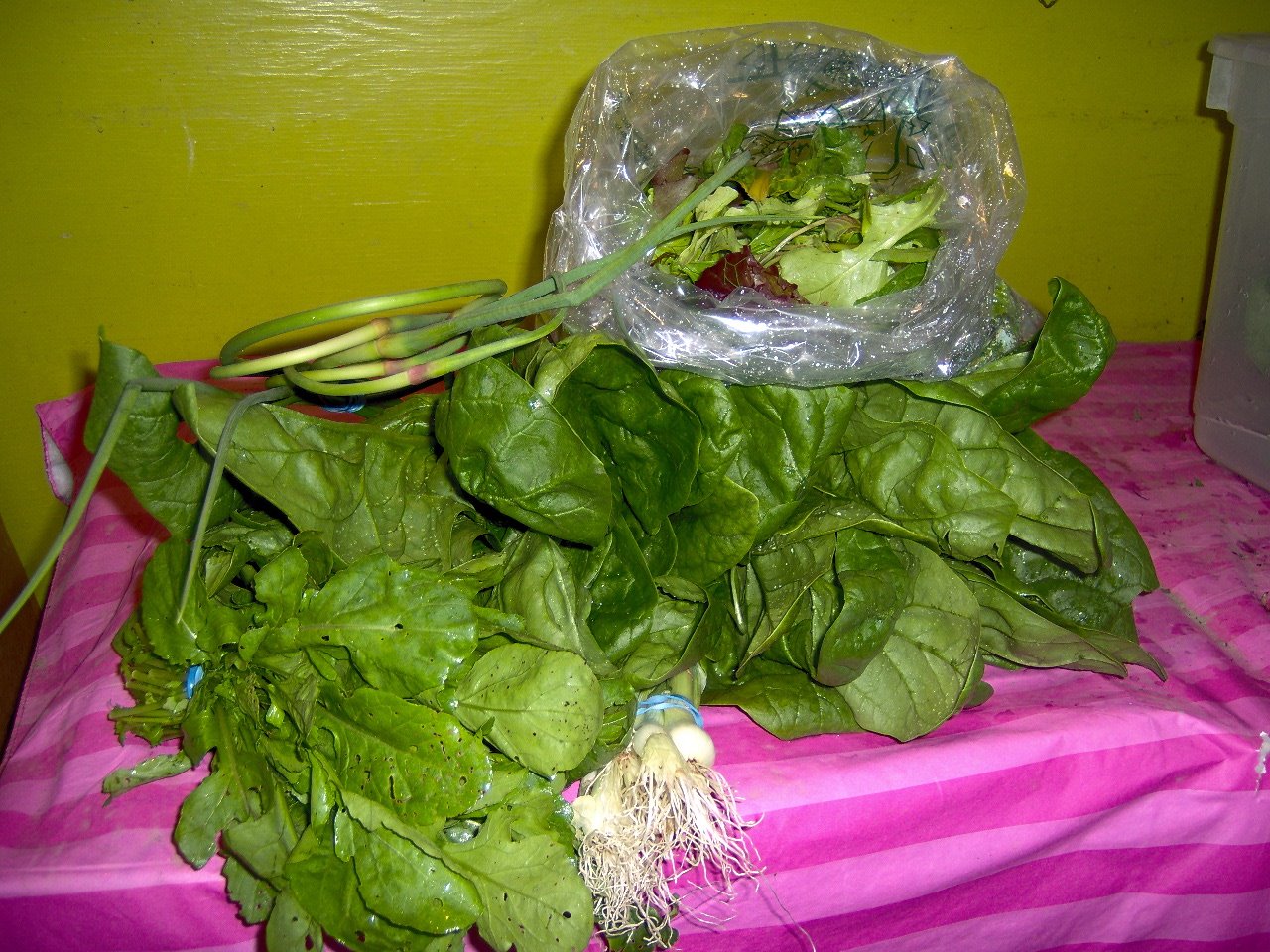 Yes, the “Swiss” arugula is full of holes, but it tastes good. All I can say is it’s a nice change from Pea Shoots, and try not to look at it while you eat it. The holes are the result of the flea beetles that hatched when it was 95° two weeks ago, but as soon as the weather cooled off they died, or failed to reproduce. Now the flea beetles are gone, we’ve had two inches of cool rain, and the arugula tastes good again.