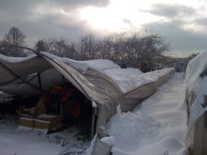 We also need to replace/repair the two greenhouses that we lost to the heavy snow, even though we scraped the snow off several times. Here you can see the frame smashed under the snow, and Mike cutting the plastic on another greenhouse to relieve the pressure and save the frame.