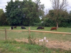 Our herd of cows increased over the winter–mostly because both Beauty and Juniper lost their pregnancies, and I was afraid of being without milk for a whole year (since it takes producing a calf to get milk). Naomi came to us about a month ago with her now 3-month-old calf. (The calf is destined to be next year’s beef, so don’t get attached.) We also found a Dexter bull on craigslist for an unbeatable price, so he’s here to get the conception job done. According to Della, the milk connoiseur, who obliged me by doing a blind taste test of both Beauty’s and Naomi’s milk, “Naomi’s milk is sweeter, but Beauty’s milk is better.” (Better, in this case means creamier–Beauty’s milk was like half-and-half when I stopped milking her in May.) Here is the herd enjoying a sunny spring day in the newly-planted pasture. From left to right: Beauty, Juniper, Mini Mo the bull (rolling), Naomi and her calf, and Smarty (now at the butcher).