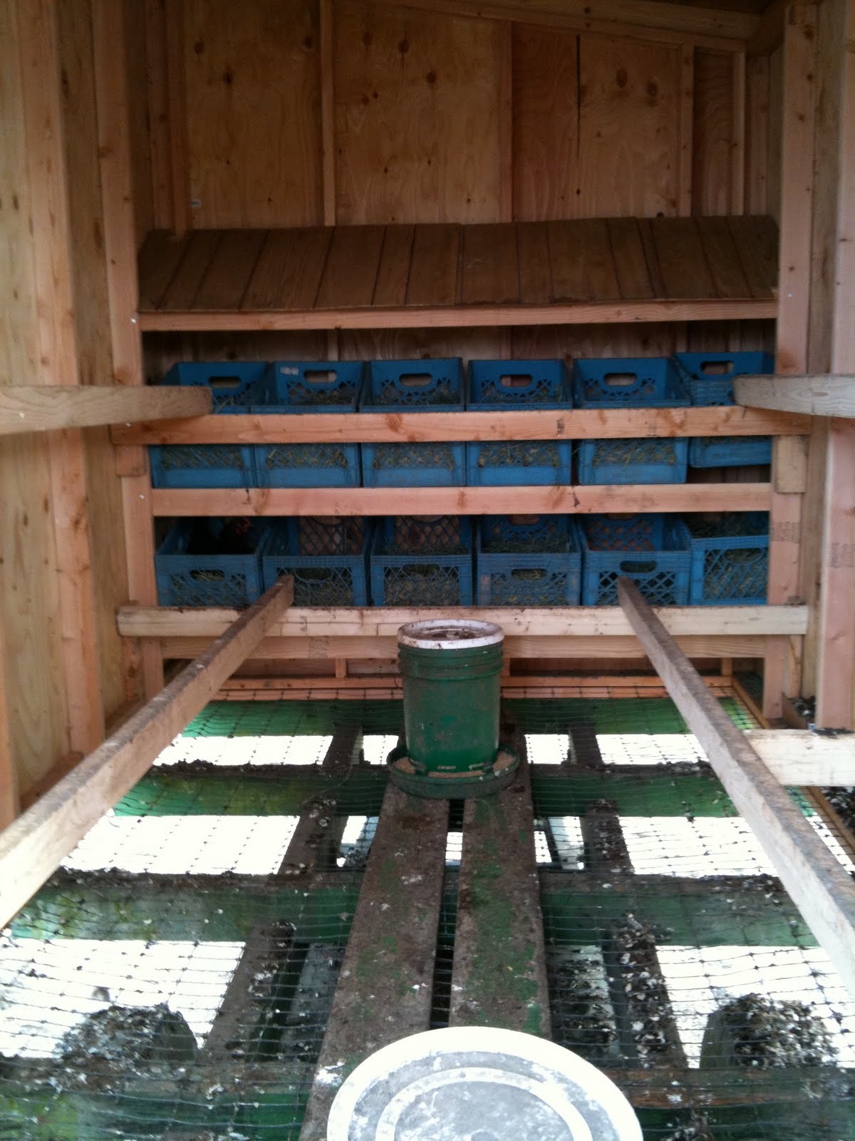 The biggest plus is that we can stand up inside this house. There is plenty of roost space for sleeping, a wire mesh floor so the manure goes straight to the ground, and a lot of nest space that is accessible by the children. More work for the kids—that’s the motto for this year.