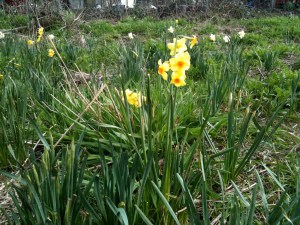 The garlic is up, and you can see it here with last fall’s leeks in the background. We’ll be picking those soon for the Spring Shares. Unfortunately, we won’t have quite as much garlic as last year (last year we had a humungous crop) because we didn’t want to risk the huge investment in case we flooded and lost it all.