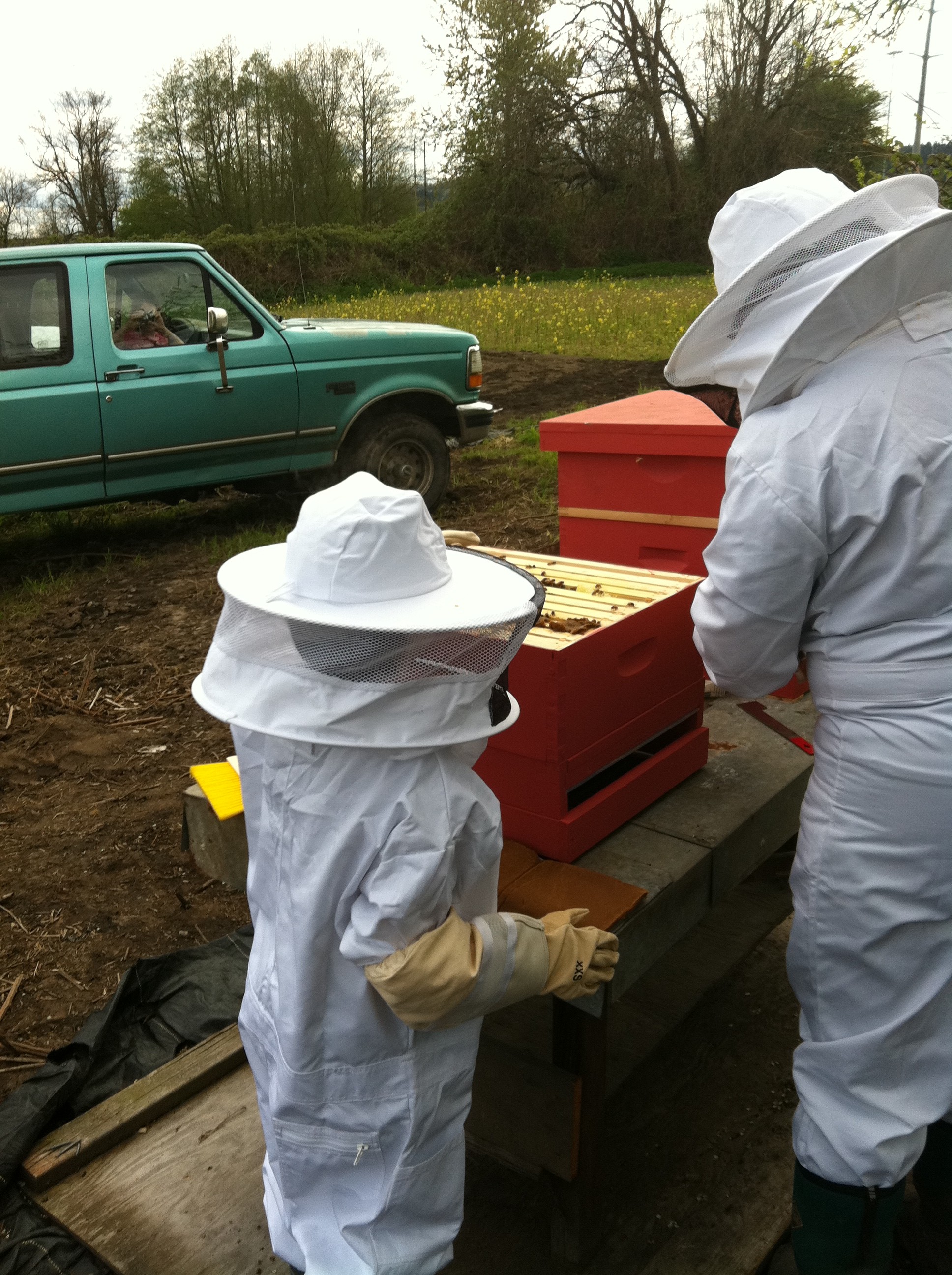 We picked up another package of bees and installed them in the second hive Friday. Cosmo assisted. Luckily his bee suit arrived Thursday. We were excited to see the bees busy building comb and raising brood in the first hive.