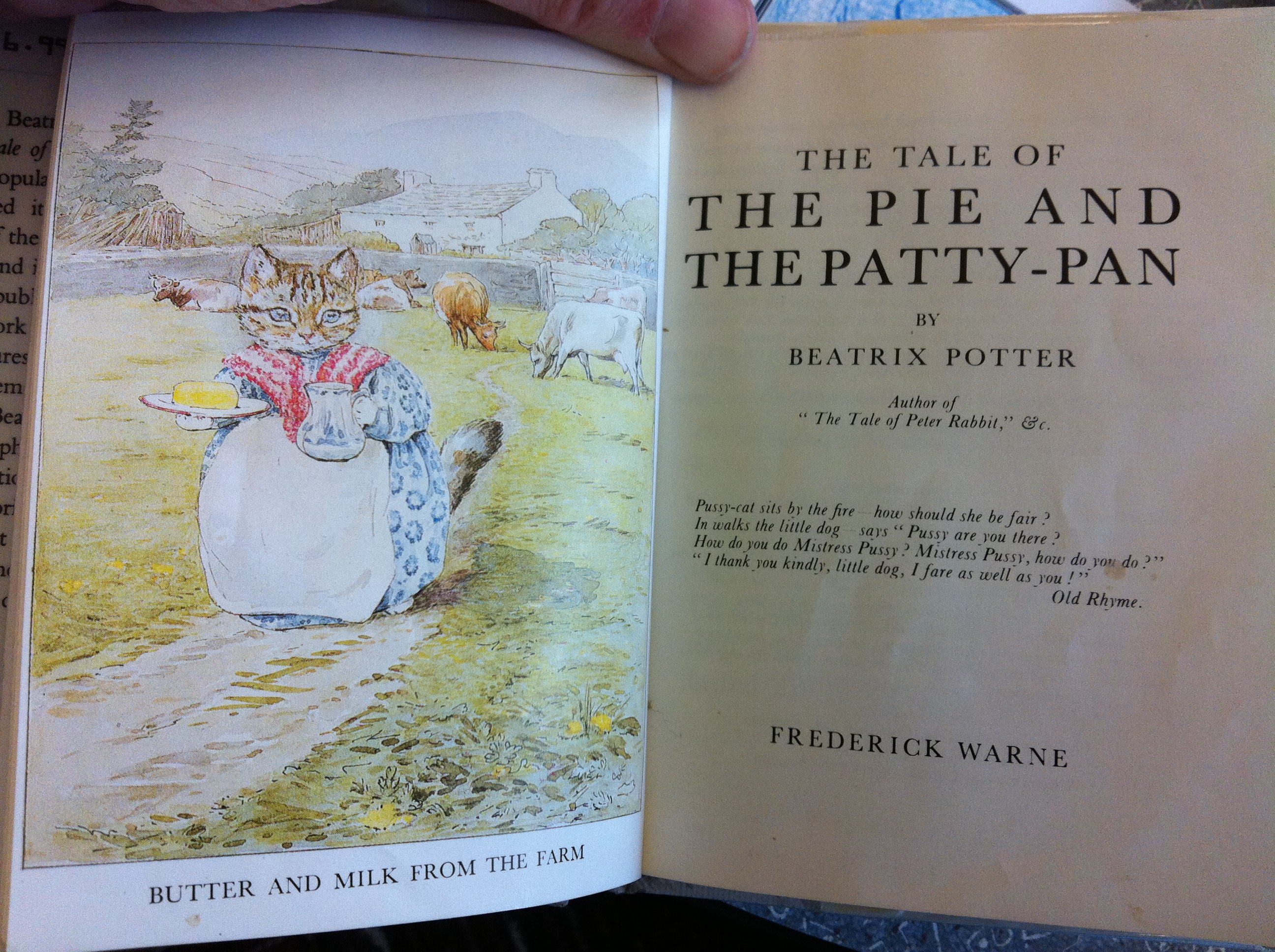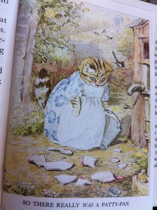 And now the story: I have wondered for years, maybe even decades, what is a pattypan? Last spring, as I sat in the childrens’ section of the library, I was browsing through the collection of Beatrix Potter books on the table. I thought I had seen them all, but then I saw a new one: “The Pie and the Patty Pan”. I gasped, and read it, and then took some pictures. I hope the copyright police don’t come and get me.