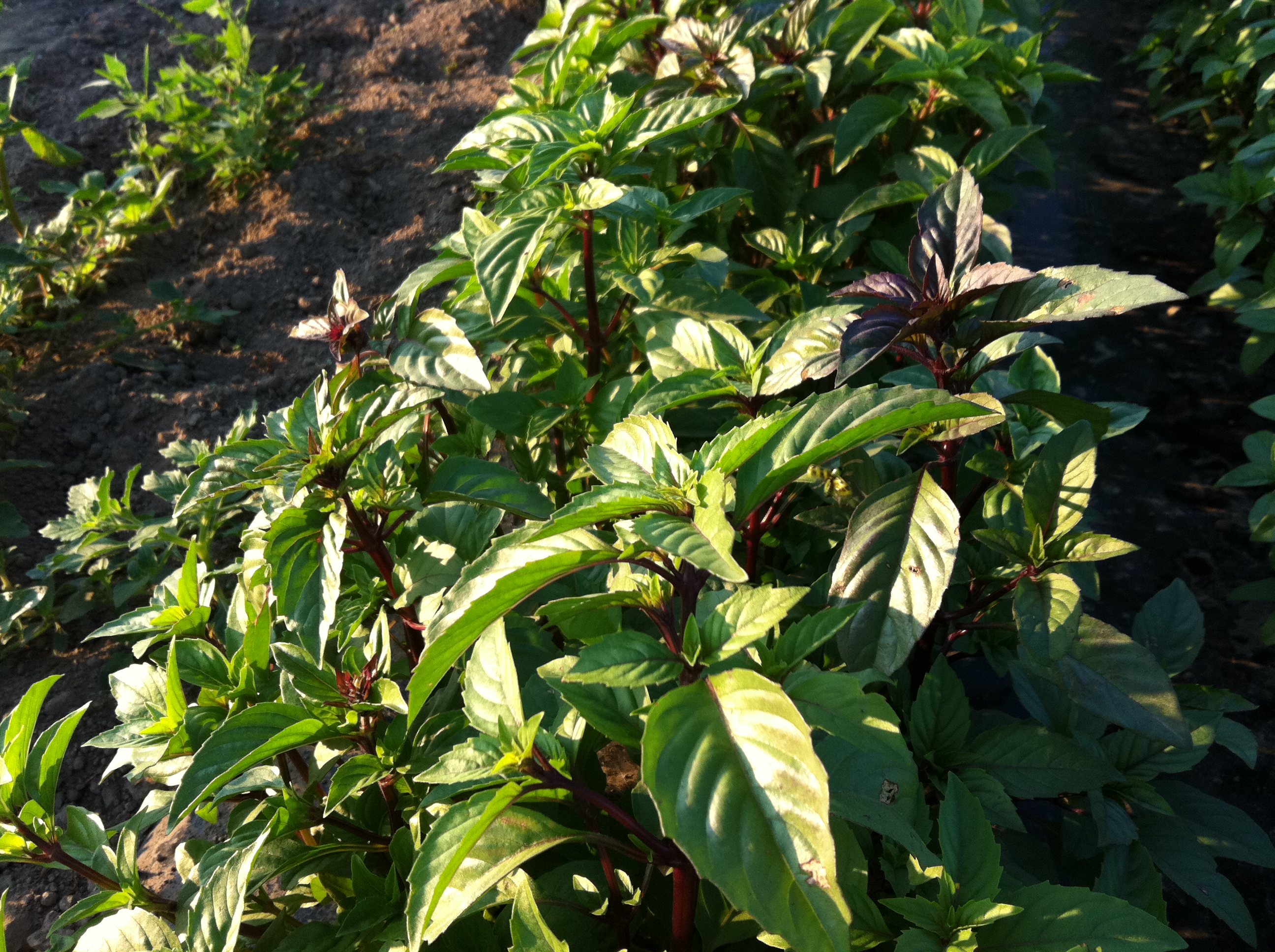 We experimented with a few new basils this year. Last week you got to try the Lemon Basil. This week we’re picking the Spice Boys. I was curious how different it would be from Cinnamon. It looks the same, but has less cinnamony sweetness, and more savory basilness. Napoletano basil has large, ruffled leaves. A little less potent scent than the smoother-leaved Genovese that we picked for you last week. It makes a good pesto, and is good for wrapping things in the individual leaves.
