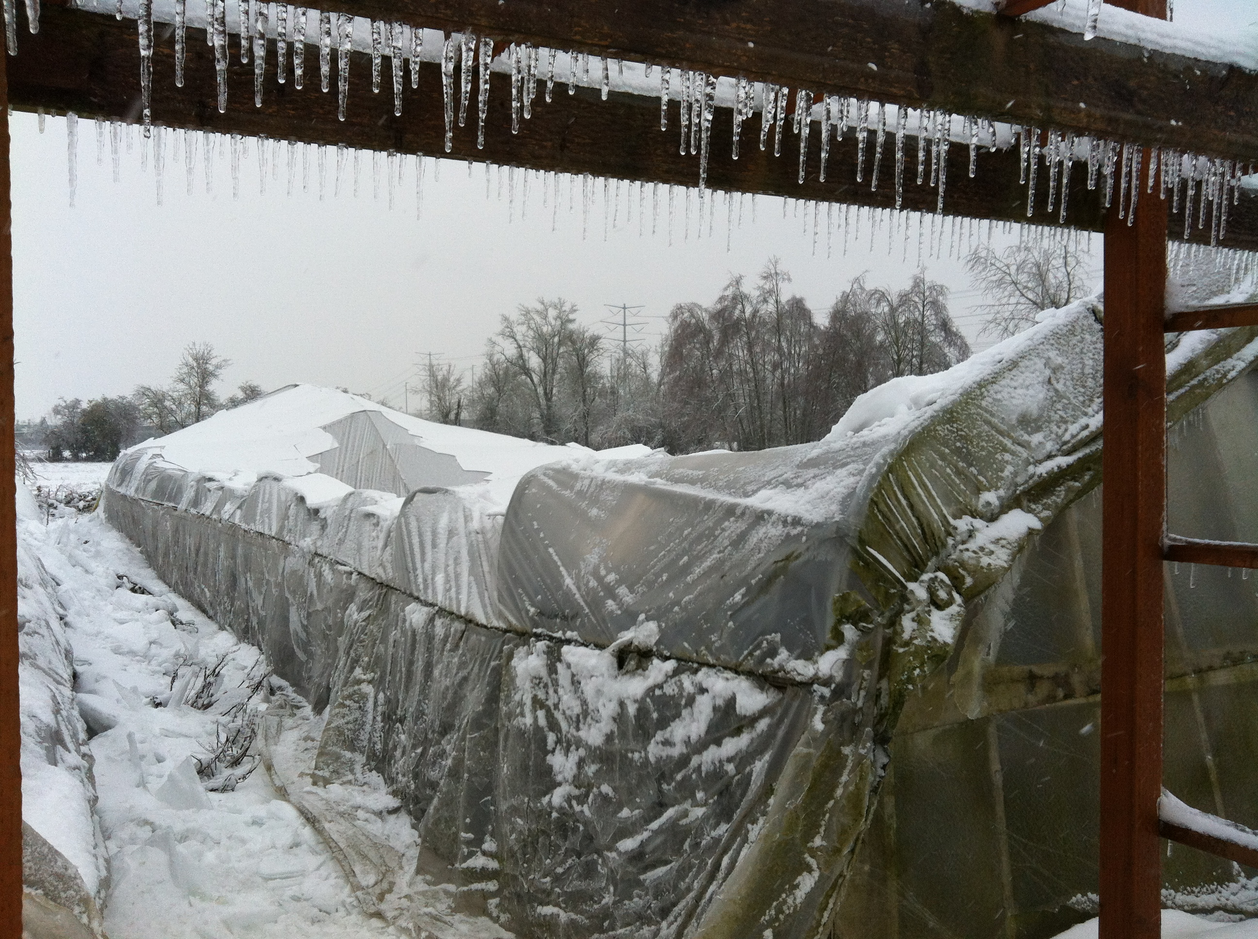But all is not lost. The greenhouses are all repaired. The big one that we planted with carrots, beets, and salad greens is doing well. The next one that we planted in spinach and radishes is nearly sprouting. Inside, the temperature is at least 10° warmer, even if it’s cold and rainy. Even warmer if the sun peeks out. We can fabricate spring if we need to.