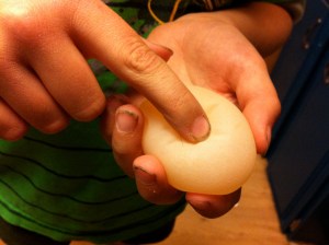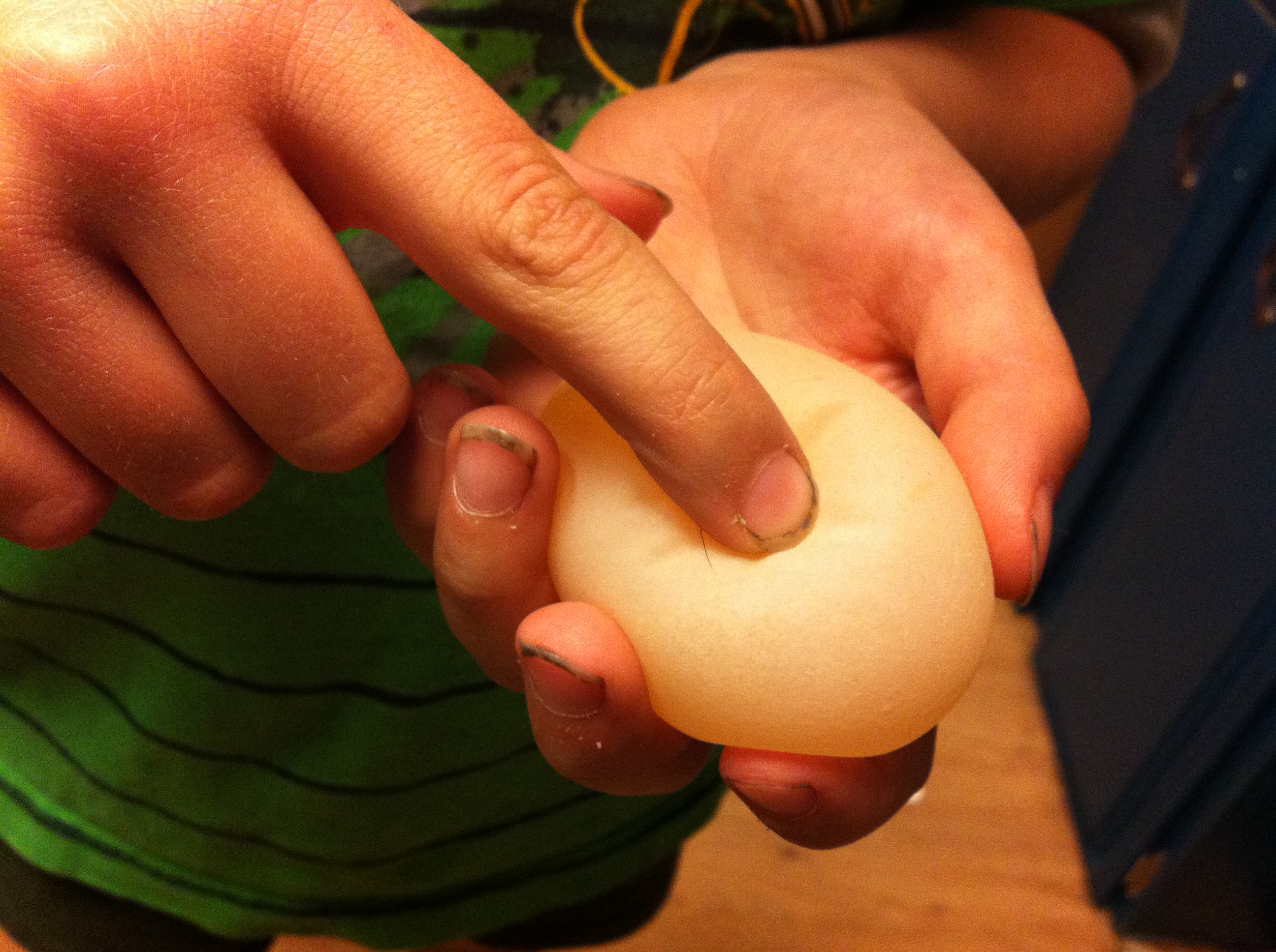 Sometimes, when chickens are just learning how to lay eggs, they make an egg without a shell. This one has the membrane intact, and is a complete egg inside, just no outer shell to protect it.