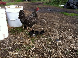 Our first hatch of the year! We found three stranded baby chicks by the hay shed, and had to search to find this mama. She had three with her in the bushes, but all were reunited successfully.