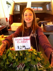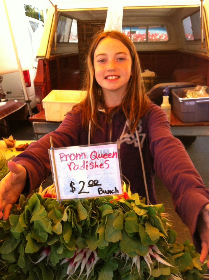 Della likes to go to market with me. This week, we have our big outdoor crop of radishes coming on. We picked some of the French Breakfast type, even though they were tiny, because they were just so pretty. Della and I were setting up the table, she picked up a bunch and announced that they looked like girls in prom dresses. Since we couldn’t find a sign for them (the sign box needs a makeover), she made a new sign. I said she could call them whatever she wanted. Now everyone knows these special radishes as “Prom Queen”, but you will never find them in a seed catalog with that name. I can’t wait to see what she names the White Icicle and Plum Purple radishes.