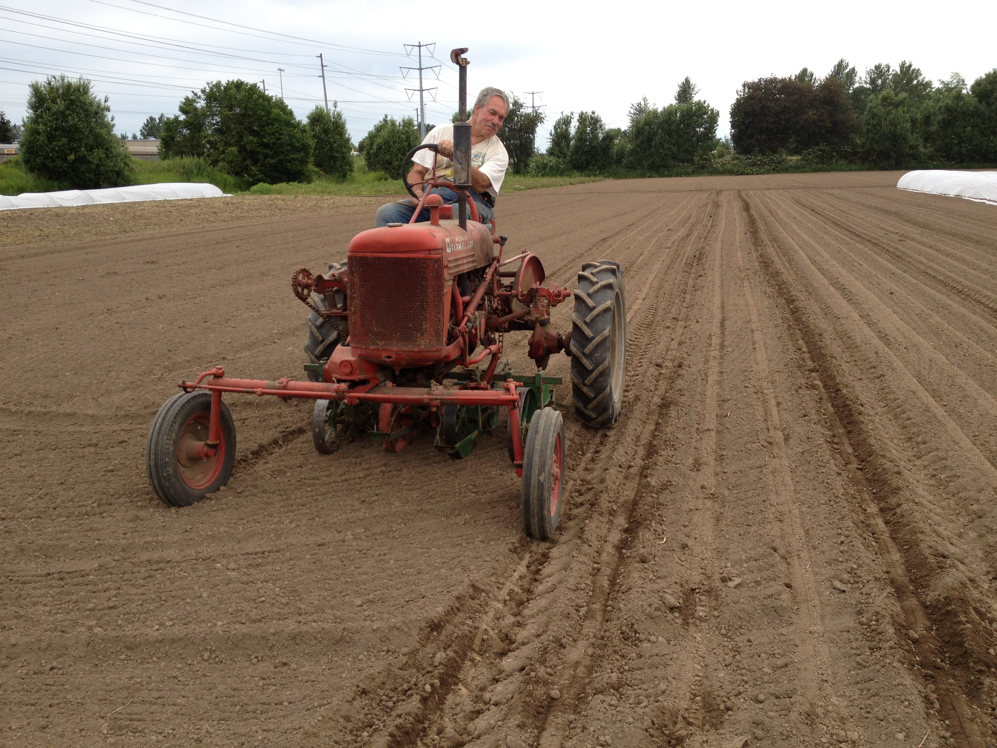 For most row crops, except large seeded things like corn, peas, squash,etc. that need lots of space, we use the 1941 Farmall Cub with belly-mounted Planet Junior planters. This way we plant four rows at a time, and calibrate the cultivator implements to the same spacing to eliminate some hand-work.