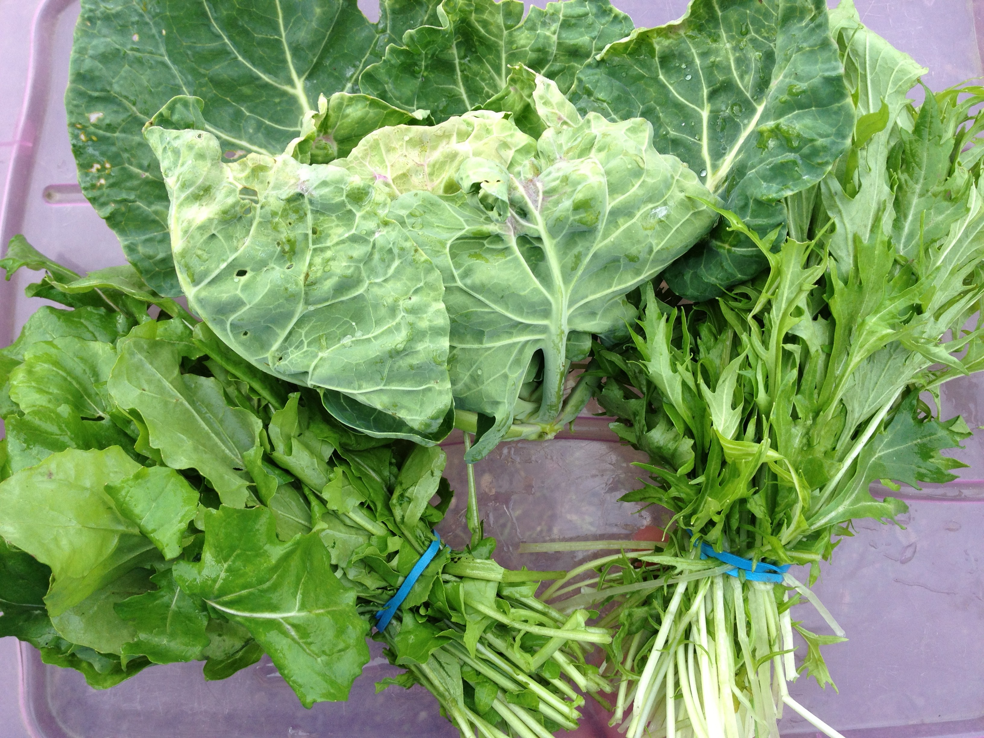 This week we picked (from l. to r.): Arugula, Brussels Sprout tops, and Mizuna.