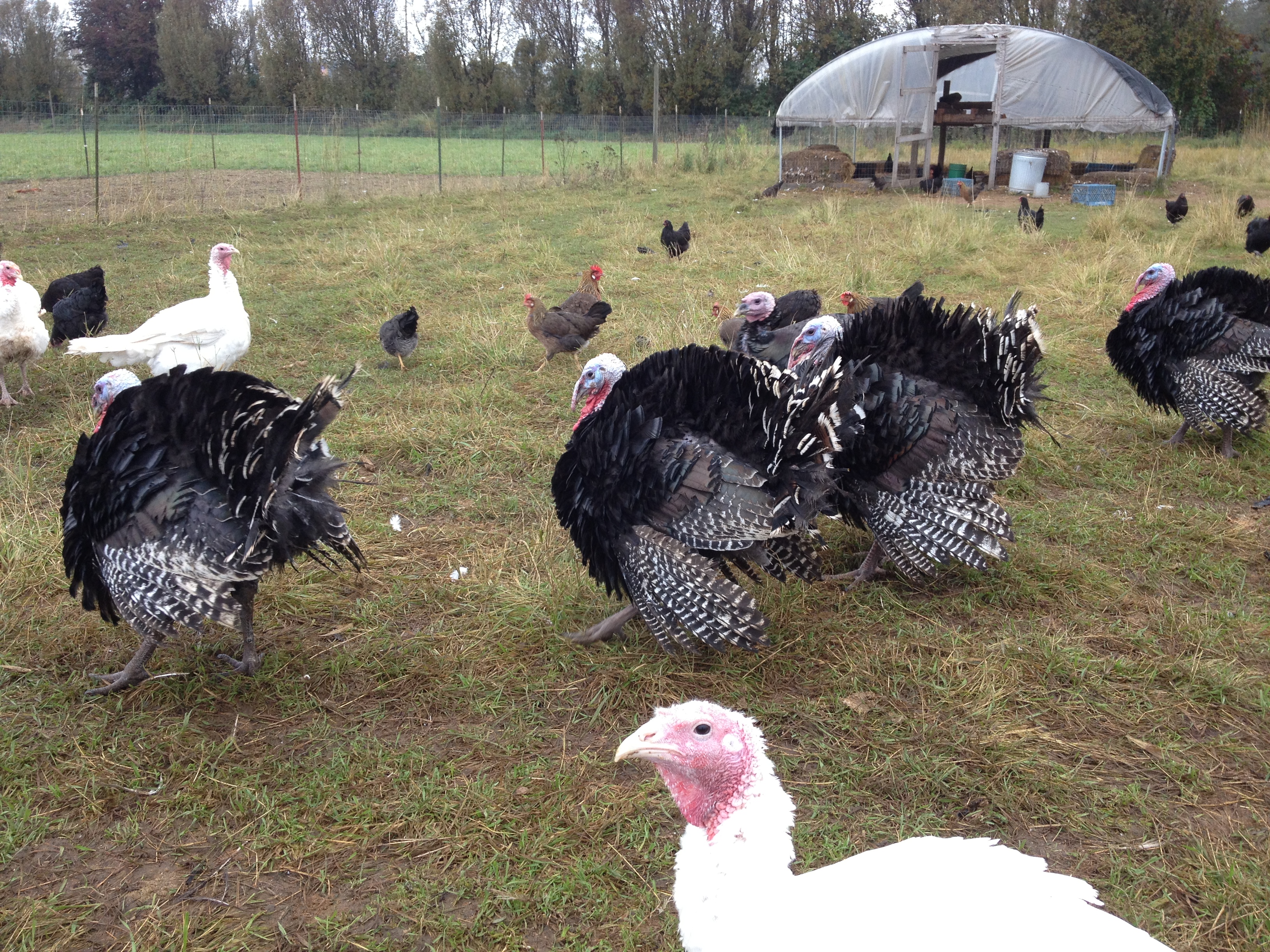 I never realized how courageous they are until it came time to butcher the giant birds. Keep in mind that at 5 months old, toms weigh about 40-50 pounds, and their wingspan is close to 6 feet. That’s a HUGE bird. When we catch them, we have to embrace them; wrap our arms around the powerful wings and try to avoid being pummeled by those wings. Last week, I learned my lesson and got hit in the face by one wing hard enough to see stars. They are powerful. And they can fly. Even our big, muscled turkeys were able to fly. So, keep them happy and they won’t leave. You know how a flock of geese or swans looks flying above you? Imagine the same thing, but twice as big, and you have a flock of turkeys. And if you haven’t witnessed a flying turkey, you haven’t seen magic. That something that large and seemingly bulky can gracefully glide through the air, overhead, is akin to seeing Santa’s sleigh and reindeer. Awesome.