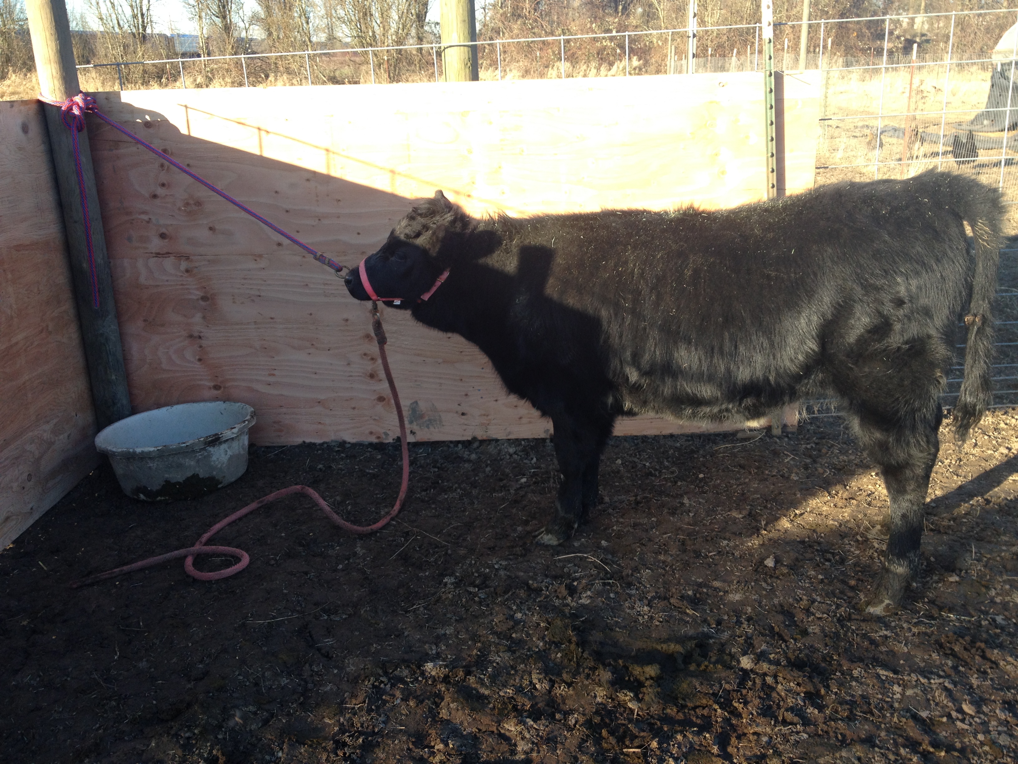 Leading up to Weaning Day, however, is halter-and-lead-training, or Calf School. The calves all get dressed in a halter, and learn how to politely walk with a human. This begins with being tied to a stout post or handle on a wall—there is always a tantrum involved, when the calf first figures out that they are attached to said post. A calf tantrum involves a lot of gymnastics and at some point they look like they are dying or having a seizure. They’re not, it’s an act. But, it’s a lot easier on the human trainer’s arms if they do this tantrumming on something immovable. I like to hang out for a while, peacefully talking about whatever is on my mind while they do the tantrum. Sometimes I walk away and come back, like a toddler time-out. But they’re not being punished, it’s a lesson. A half-hour is usually enough at first, and then they are given back to their mom, so they learn that it’s all ok. Eventually I let them eat while they are tied and they figure out it’s really not so horrible and doesn’t last forever. Then, I can start leading them in a small enclosed space.