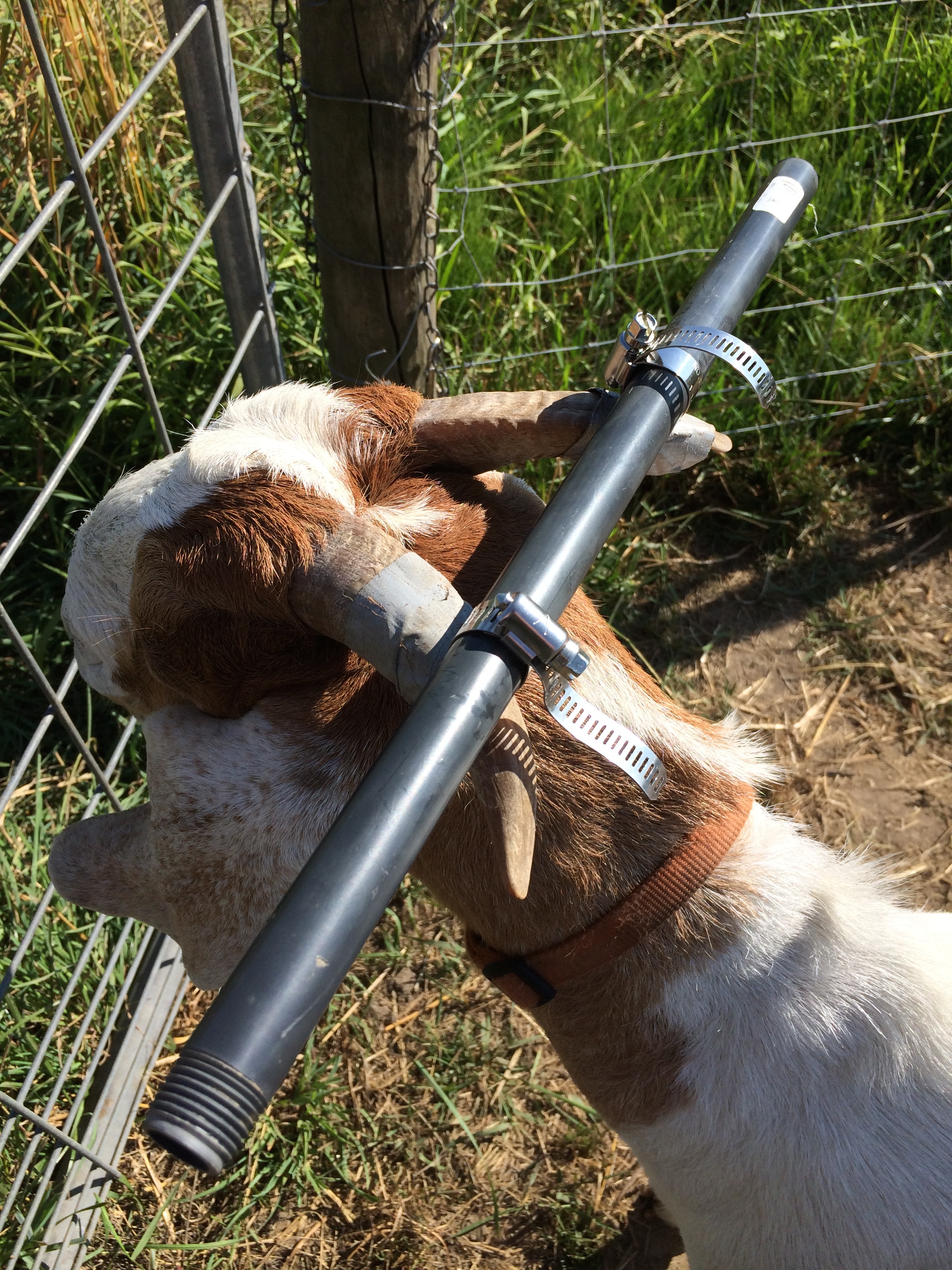 Don’t be alarmed when you see Rigby with his new headgear. We had to come up with something to keep him from getting his head stuck in the fence. We were freeing him a dozen times a day, and eventually the worse was bound to happen. Problem solved with a few hose clamps and pvc pipe.