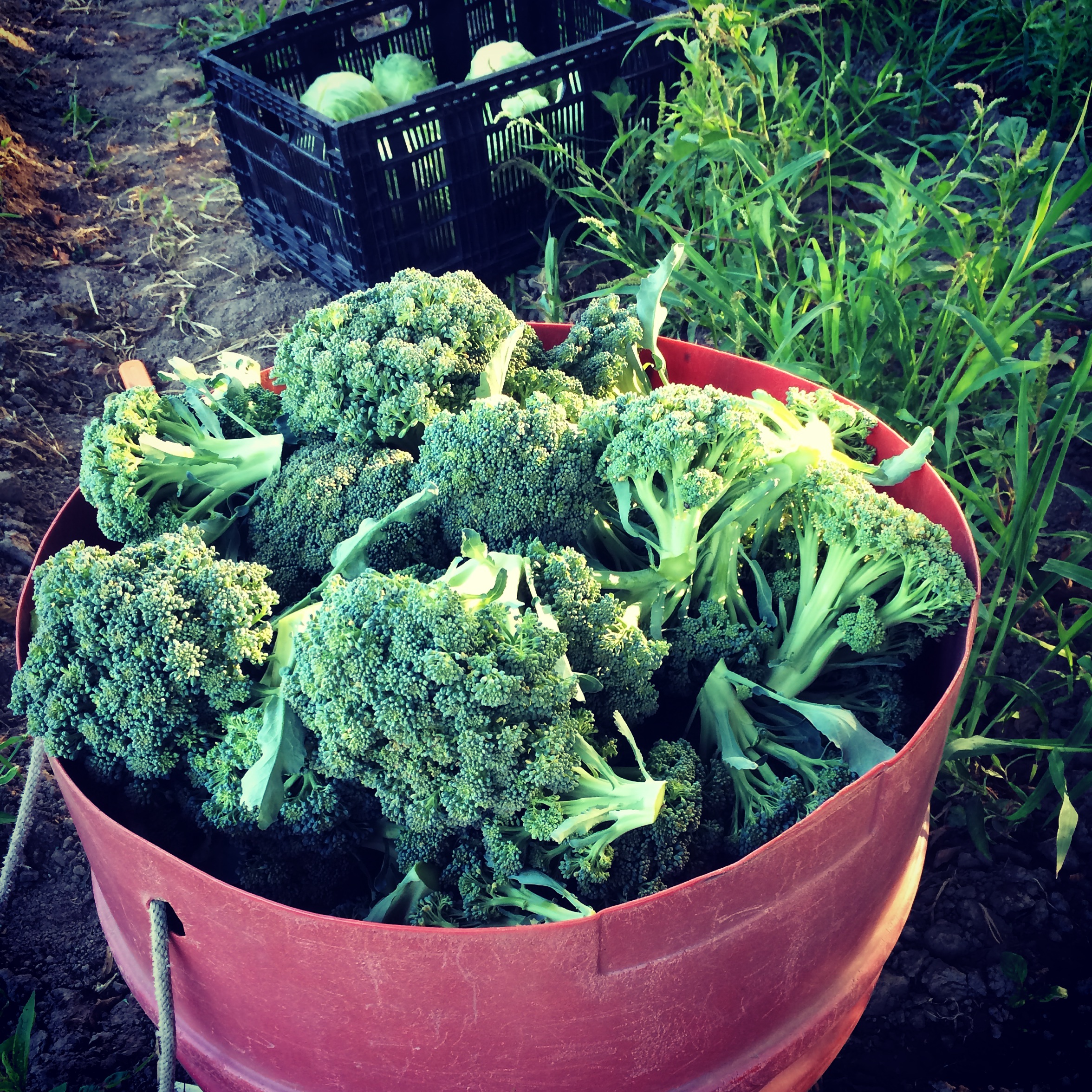 During that sudden hot spell, we watered nearly 24 hours a day. High temperatures dry the soil, and water becomes the difference between life and death. The only thing is that when water is added to hot plants, they grow exponentially! Suddenly ALL the beans were ready, the lettuces were huge, and the cabbages and broccoli were heading up fast! This, we are out if beans until the next patch is ready (soon) and we have rolled into brassica season.