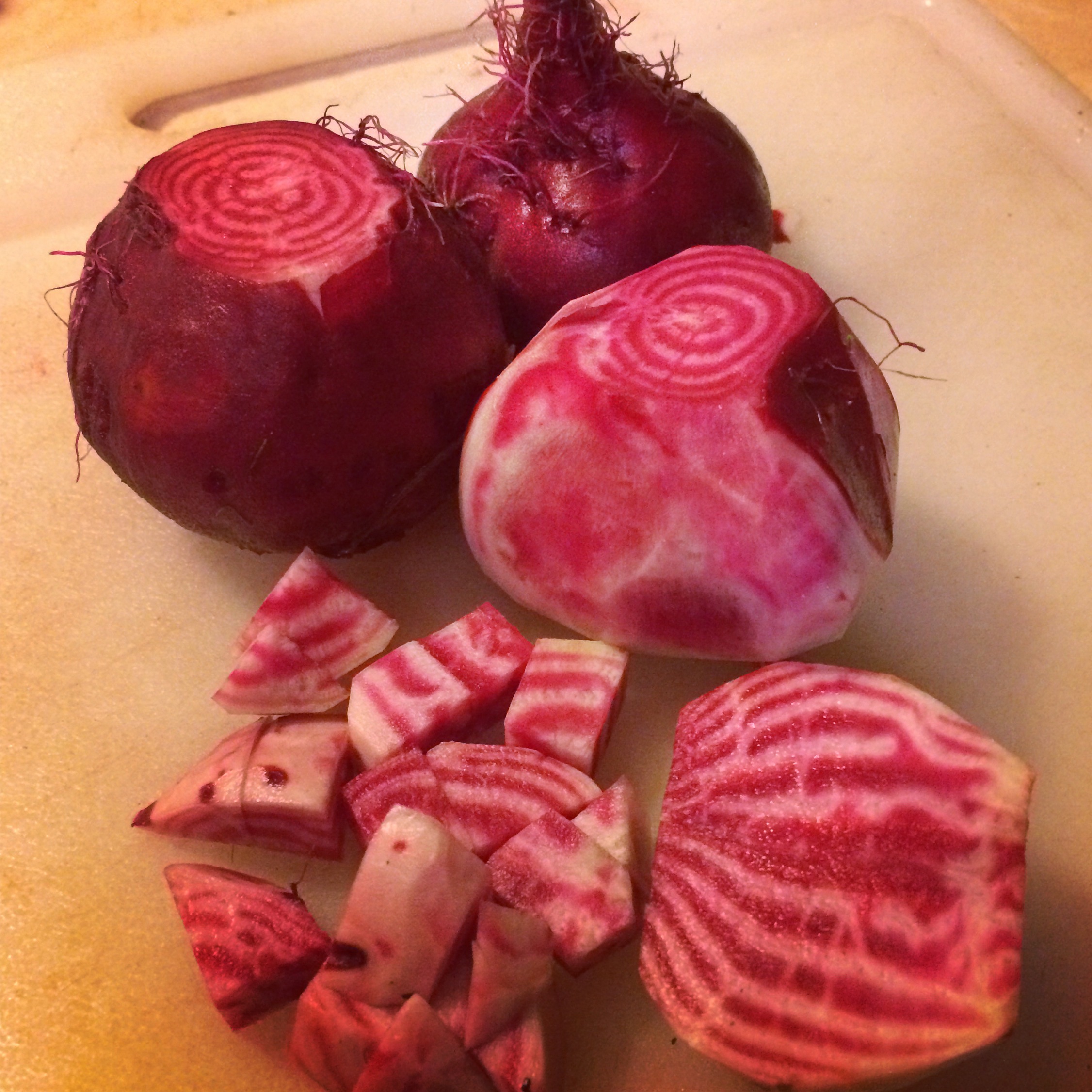 October Hash: Cubed “Yukon Gem” Potatoes, “Chioggia” Beets, Fennel, Torpedo Onion, and “Lipstick” Peppers.