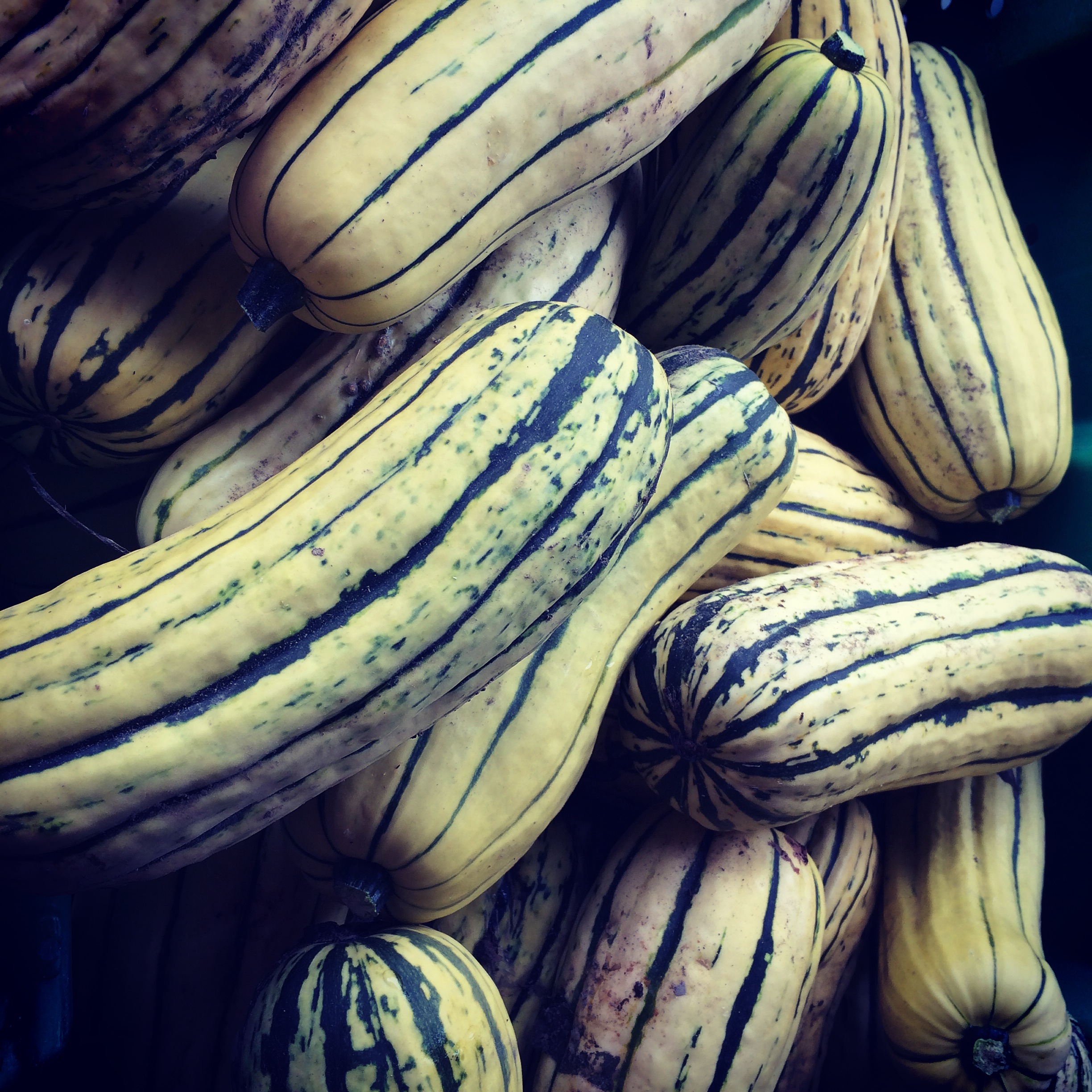 One of our favorite squashes. Just cut in half and bake at 350°, cut side down. I like to oil the edges before cooking to keep them from sticking. You can also cut the other direction so you get rings and put them on the pan, well oiled. You can eat the skin, too, if you want.