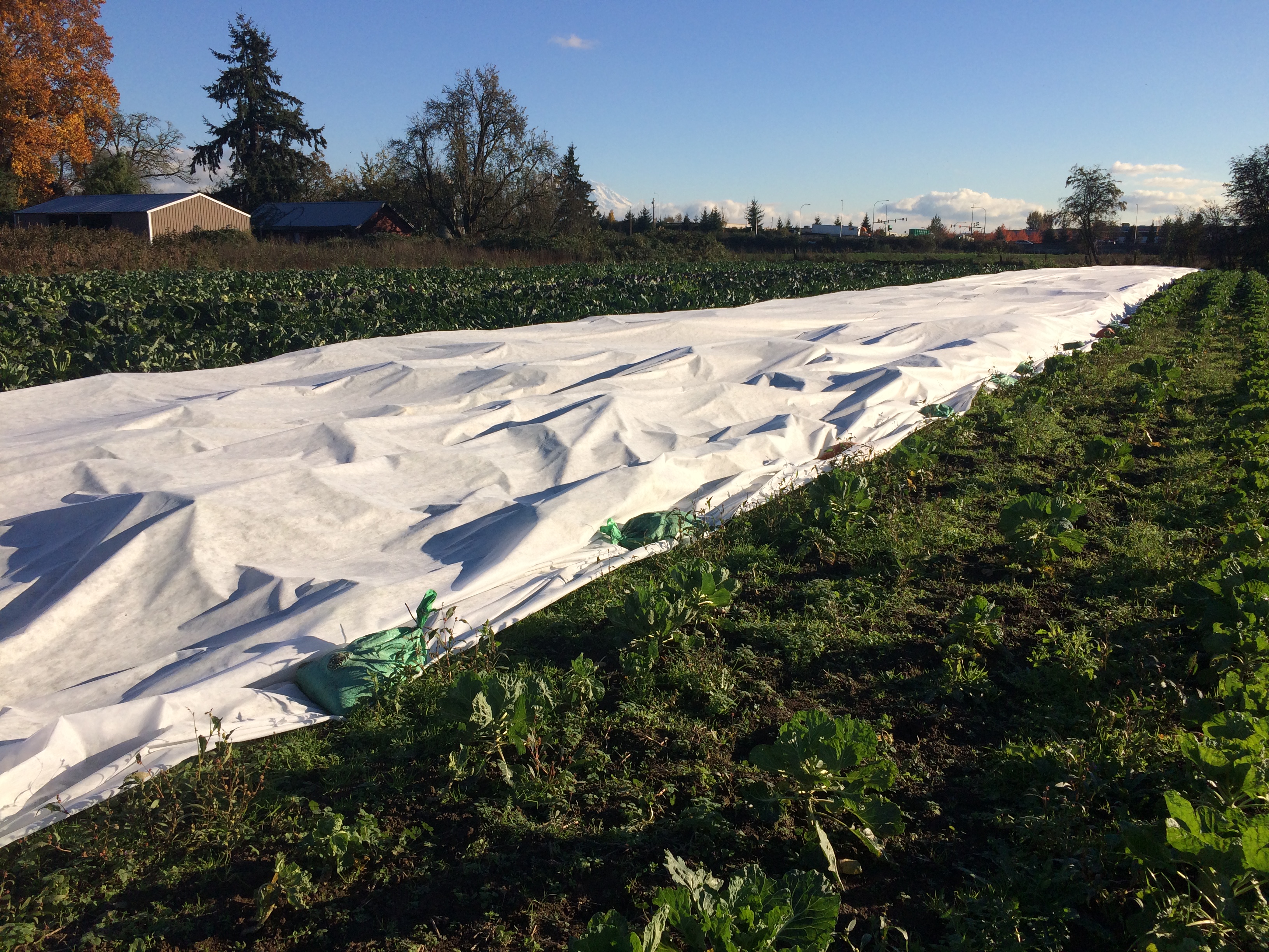 Goodnight, Cauliflower. Preparing for the Arctic Blast by covering the nearly-ready cauliflower patch with frost blanket anchored by sandbags. Hopefully it does the trick. There are nearly 2,000 heads of Romanesco, Purple, and White cauliflower, nearly ready to harvest. They just need another week or two. Brussels Sprouts on the right, Cabbages on the left. Mount Rainier in the background.