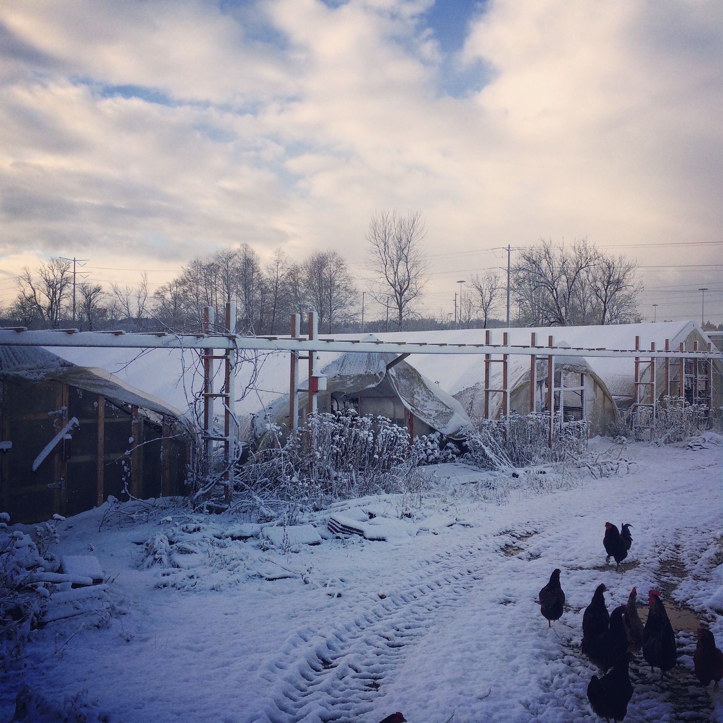 At least for Episode 2 of Arctic Blast we got some snow! Snow before freezing is actually better, because it insulates the crops and keeps them moist. That dry cold is a killer. There are radicchios under this snow, covered with frost blanket.
