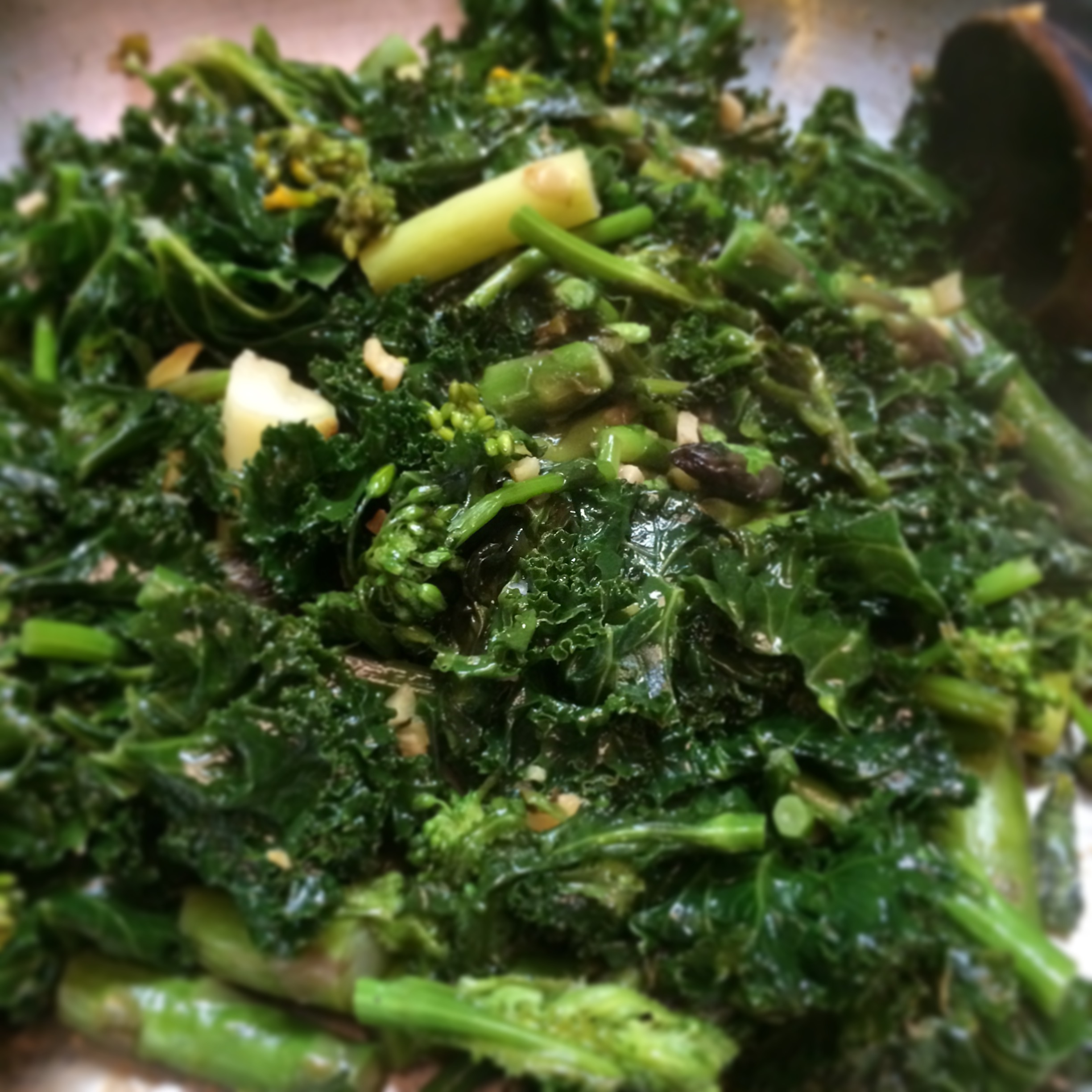 After Easter, my kids were begging for healthy food, “like greens”. So, I mixed up the last bunch of broccolini, the last bunch of curly kale, and a small bundle of asparagus. With garlic and olive oil. Hits the spot!