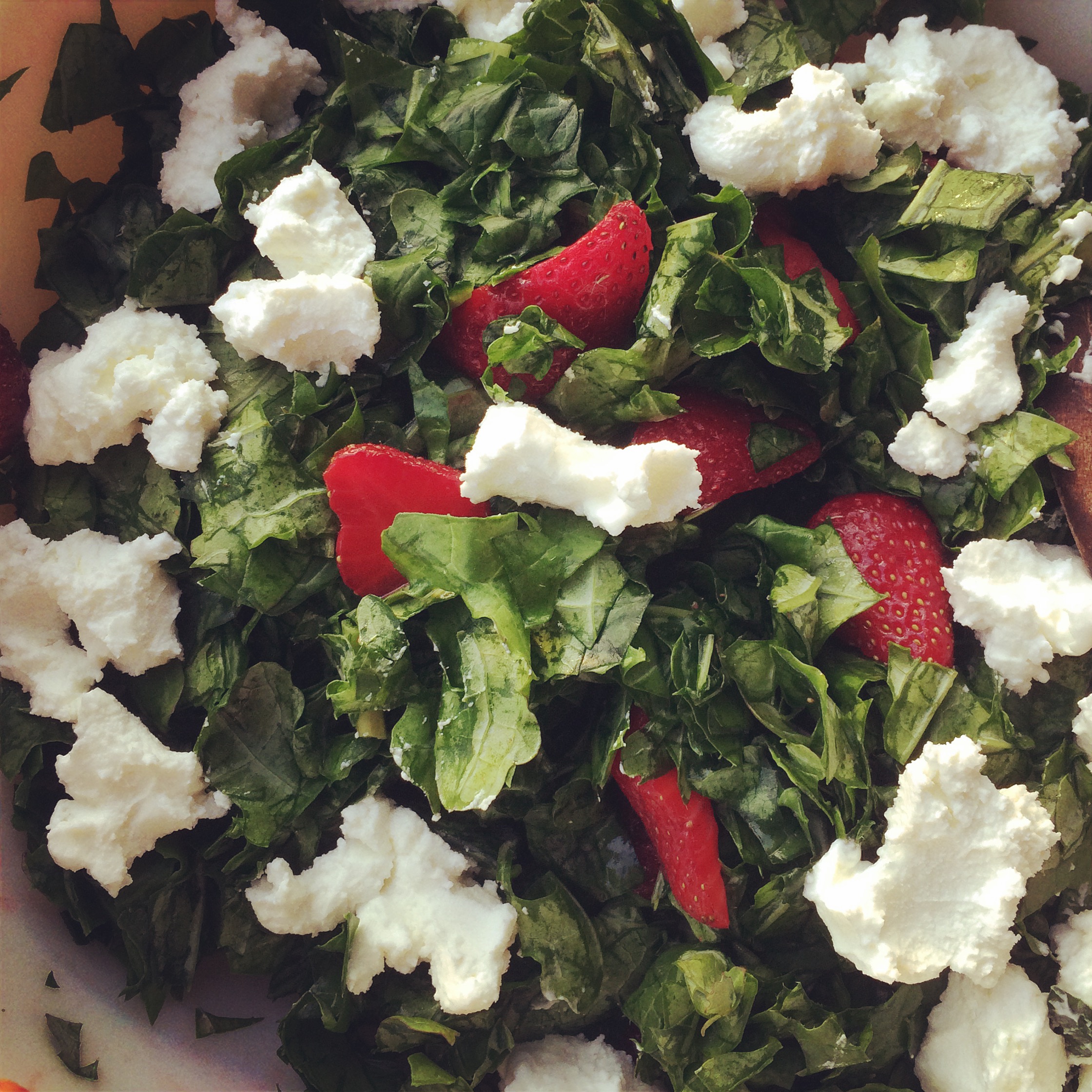 - To assemble the salad: Drizzle in the salad dressing (you might not need all of it) and toss well, until all of the kale is lightly coated in dressing. Add the sliced strawberries and chopped radishes, then use a fork to crumble the goat cheese over the salad. Toss again, then sprinkle with a couple handfuls of granola. For best flavor, let the salad rest for 15 minutes before serving (this gives the dressing time to soak into the kale).