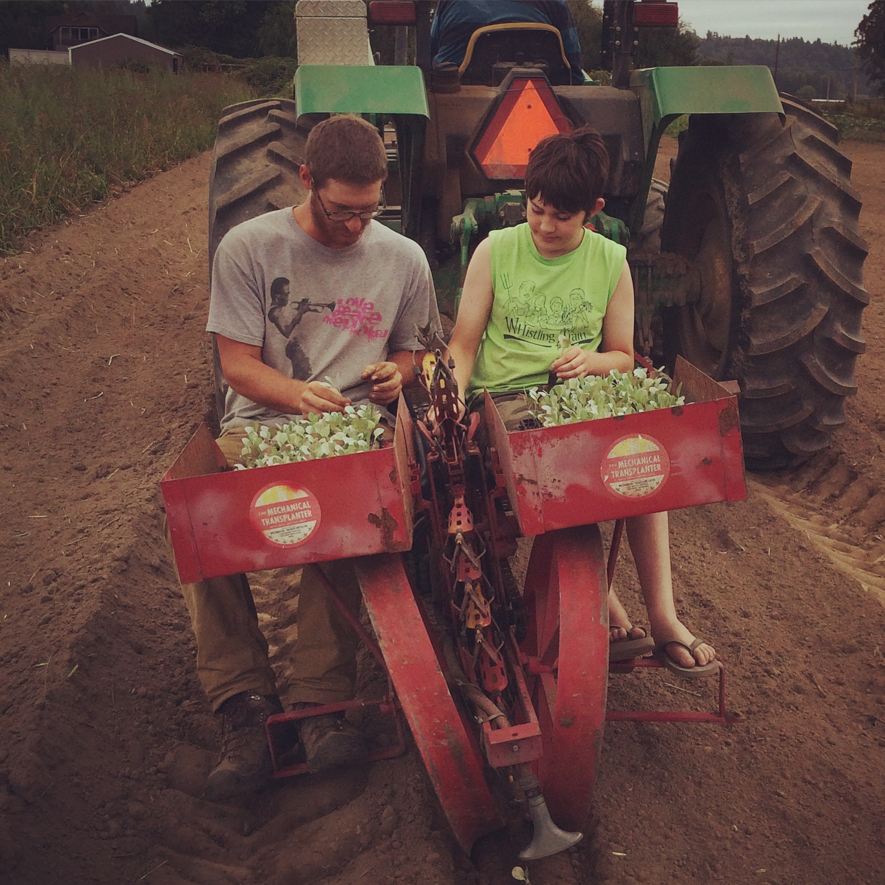Our new intern, Jeff, has quickly settled in and is already a huge help. Here Cosmo is showing him how to use the transplanting machine to put in the last of the cabbage plants for winter.