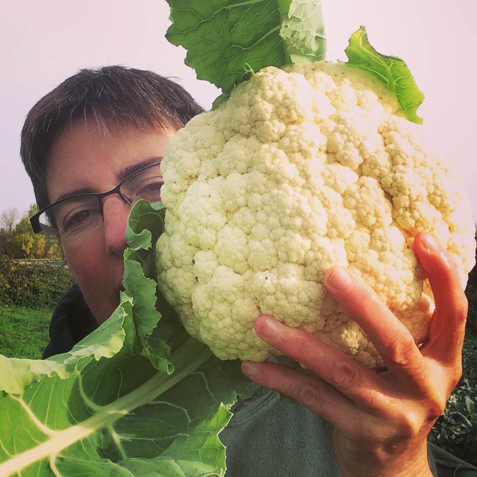 The Brassicas this fall are stunning—it’s been a challenge to keep the cauliflower heads and broccoli crowns at a manageable size. This one was easily bigger than my head. They’re delicious this time of year though, so eat up. So far, no frost!