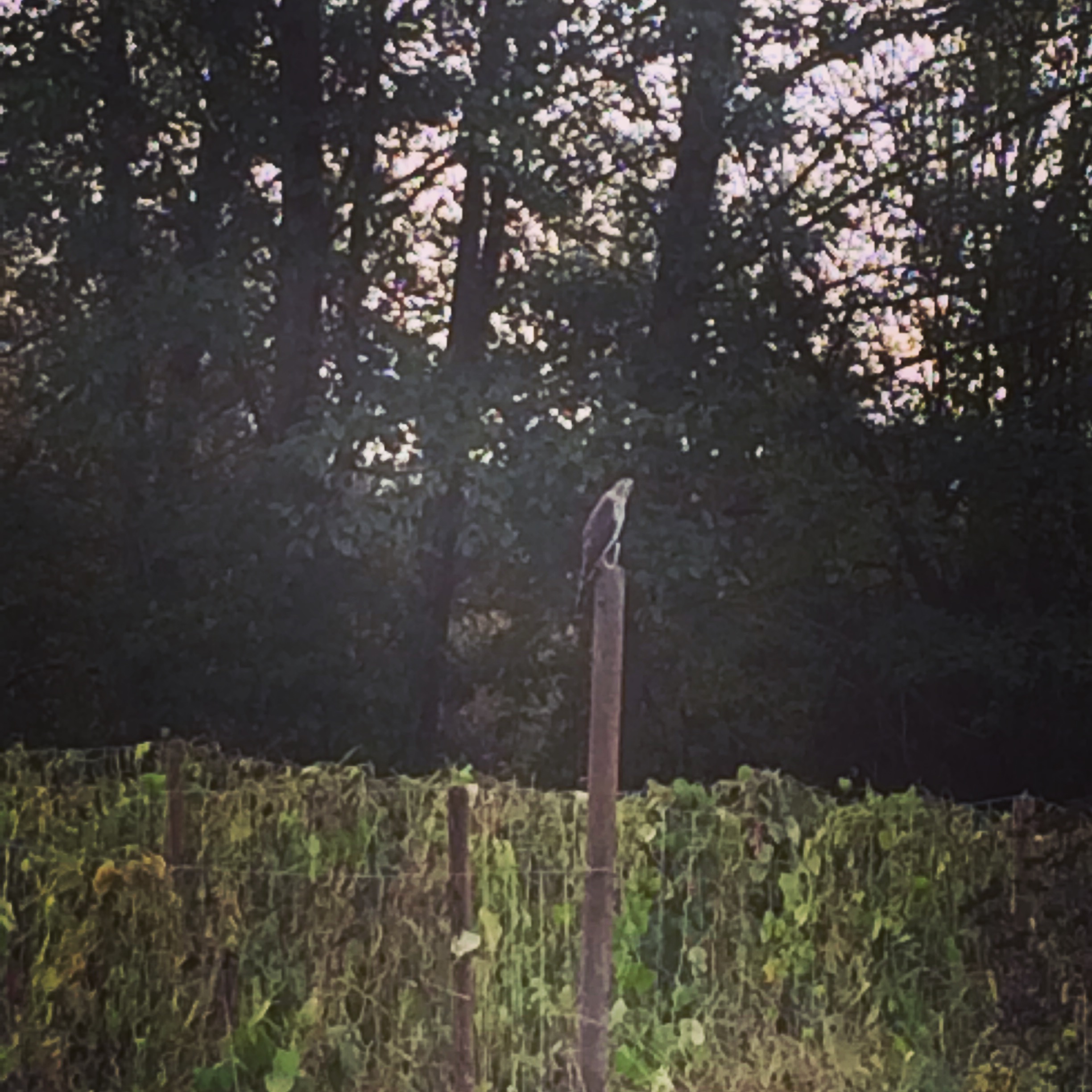 This little woodlot at the back of the farm is an incredible source of biodiversity. It’s full of songbirds, frogs, and raptors! This Cooper’s Hawk wouldn’t let me get any closer, keeping an eye on me in the cauliflower from its’ bean-pole perch. It was a beauty—and scared all the songbirds away for a bit.