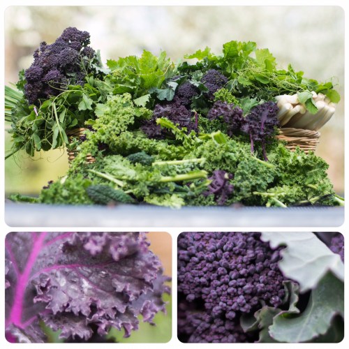 Green Garlic, Purple Sprouting Broccoli, Rapini (a.k.a. Broccoli Raab), Pea Shoots, Spring Onions, and tender Mixed Kales.