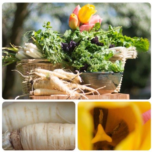Parsnips, Rapini (Broccoli Raab), Spring Onions, Pea Shoots, Green Garlic, Mixed Cooking Greens, and U-Pick Tulips and Daffodils.