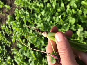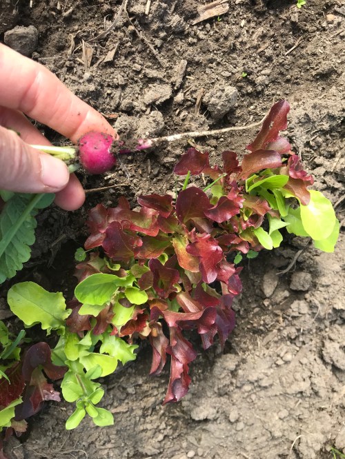 The first warm week of spring is always a challenge, as the overwintered crops like kale, raab, and chard all go to flower. And the newly planted crops are not quite big enough for harvest. I’ve been stewing about this since last week’s harvest, evaluating all the new things. The radishes are still tiny, the salad greens are harvestable, but if I pick them now, we’ll only have them for two weeks. After a week of sun, they’ll be twice as big and I can harvest for 3-4 weeks, when the outside planting will be ready. The turnip and beet greens are luscious, but the same situation. If we wait one more week we’ll have twice as much. Plant growth is exponential when the weather is warm and sunny, and all of these first plantings are in greenhouses, making them extra quick.