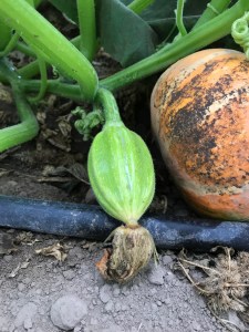 Winter squashes are setting and ripening. Here a Table Queen acorn squash cozies up to an Eastern Rise squash.