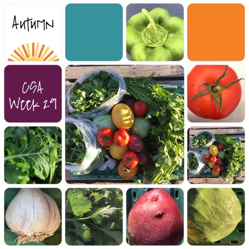 Fall is definitely here! Cabbages, Potatoes, Spaghetti Squash, Garlic, Stir-fry Greens (baby kale and pea shoots), Celery or Green Peppers, and Tomatoes or Eggplants.