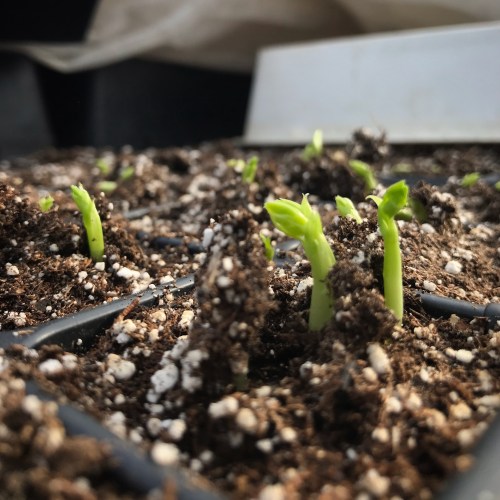 I planted these babies two weeks ago. Covered them with a cage to keep the rodents from digging them up, placed the flats on a heated sand table to keep them above the chill, and added a cloth cover to help moderate the temperature inside the greenhouse. That was before we knew Snowpocalypse was coming. Somehow, through the days of snow, and the temperatures in the teens, they managed to mostly germinate. A few lost out to mold, but most are popping up today, and I am thankful. Early greenhouse peas for all of the eaters! Look for them sometime in May!
