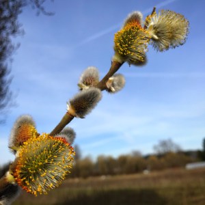 As soon as the weather warms, the pussy willows bloom. Those furry grey buds are actually flowers, and their pollen is important baby bee food.