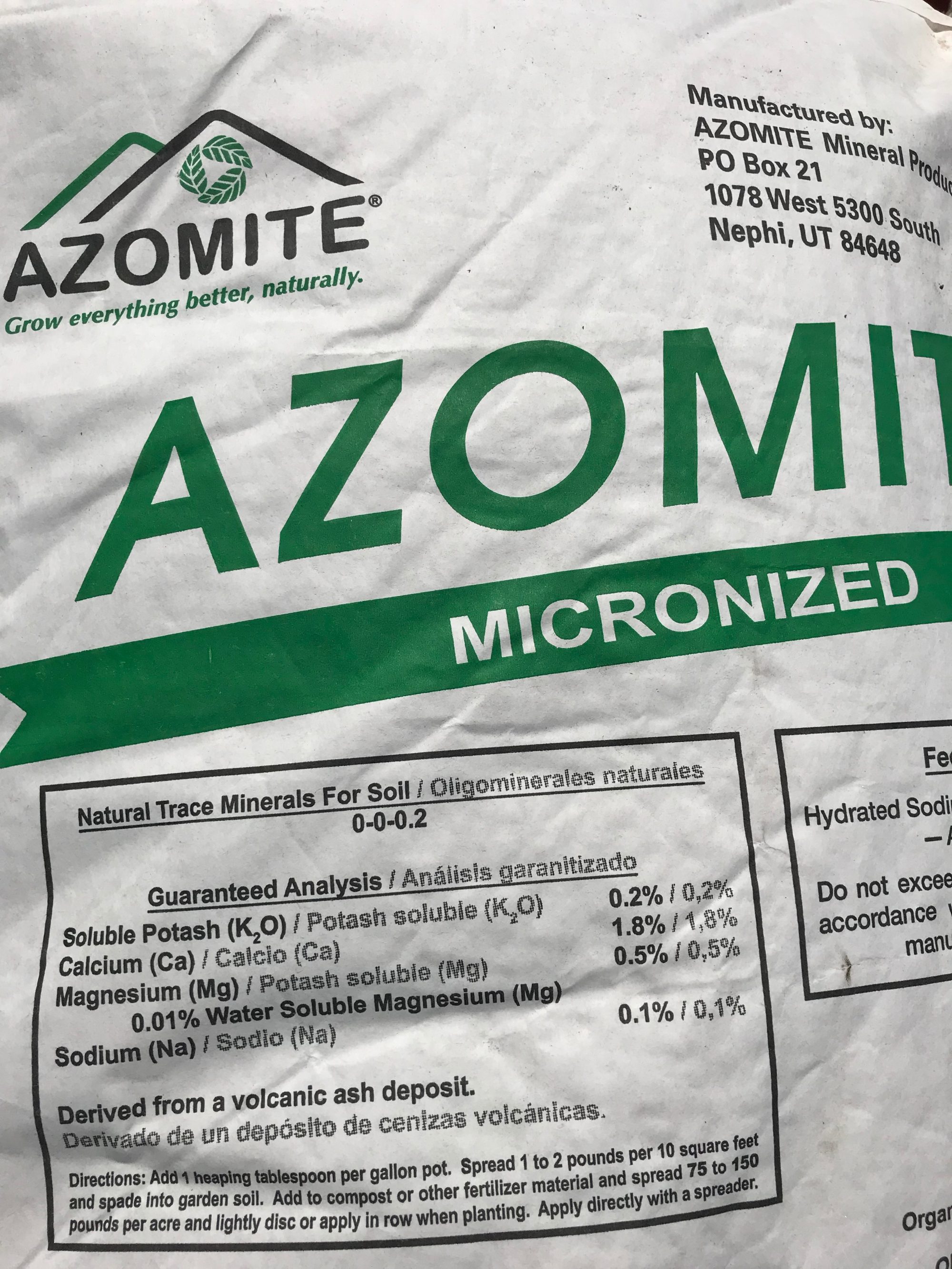 I believe strongly in remineralizing our rain-leached soils with rock powders. Azomite is mined in Utah from a 35 million-year-old volcanic ash deposit, inundated by an ancient sea. It’s brimming with Potassium, Calcium, and Magnesium, but also packed full of trace minerals.