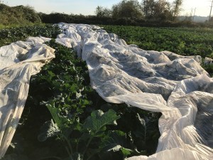 Temperatures in the low- to mid-20’s were forecast for this week, so we hustled to put frost blankets and row covers on the more delicate crops, like radicchio, escarole, broccoli, and cauliflower. These fabrics don’t seem like much, but they can raise the temperature 2-4 degrees, which can be enough to keep frosty air from damaging or even ruining the crop. It means moving huge pieces of flimsy material and lots of sandbags, but if it works, it’s totally worth it.