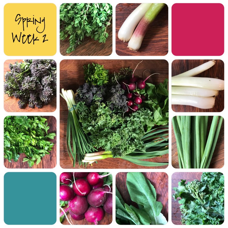 Clockwise from Top Left: Italian Parsley, Green Garlic, Green Shallots, Kale, Purple Radishes, Fresh Thyme, and Purple Sprouting Broccoli.