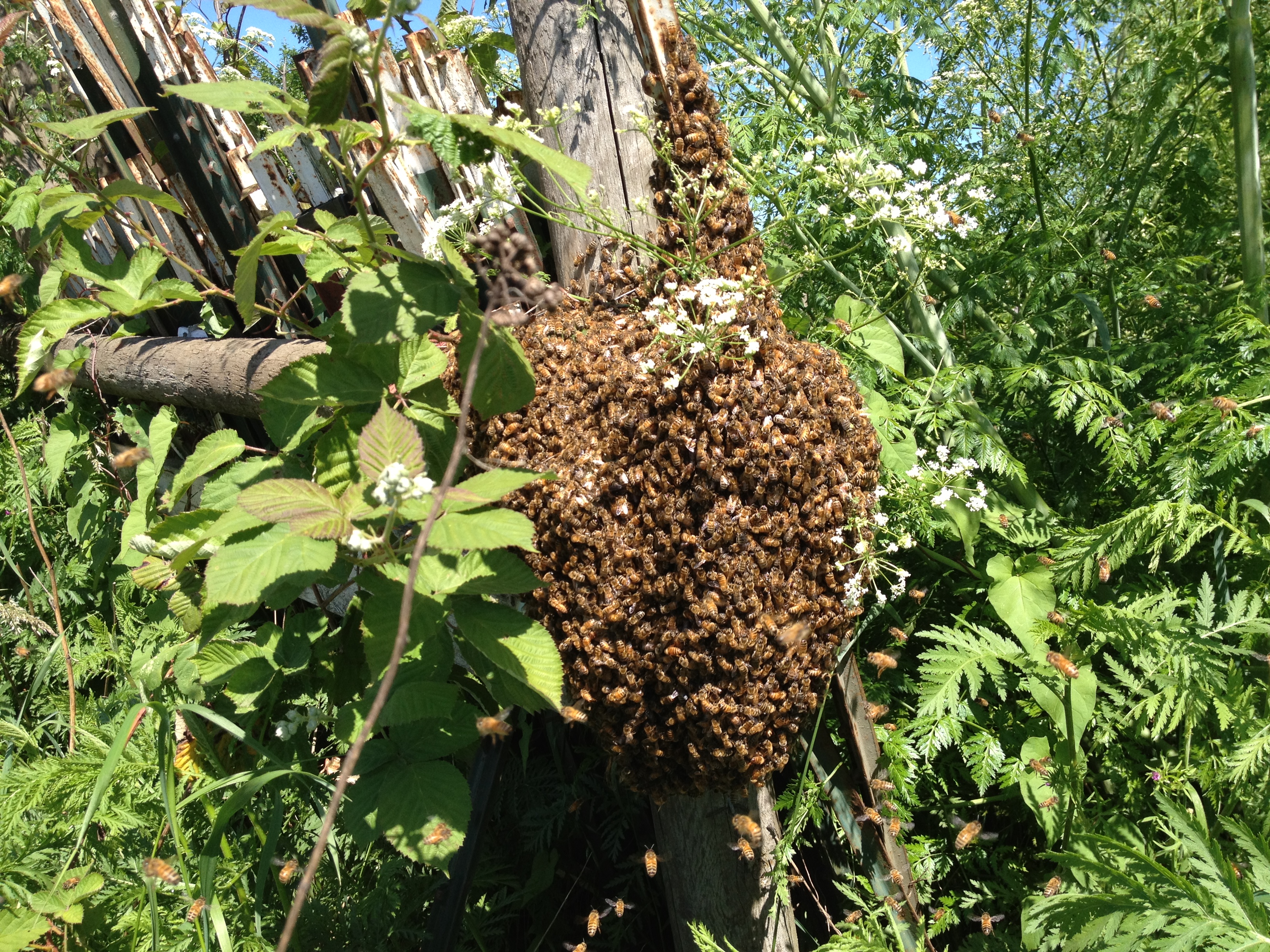 We were lucky the bees didn’t go far when they swarmed. I was able to sweep them into a box and put them into an empty hive box.