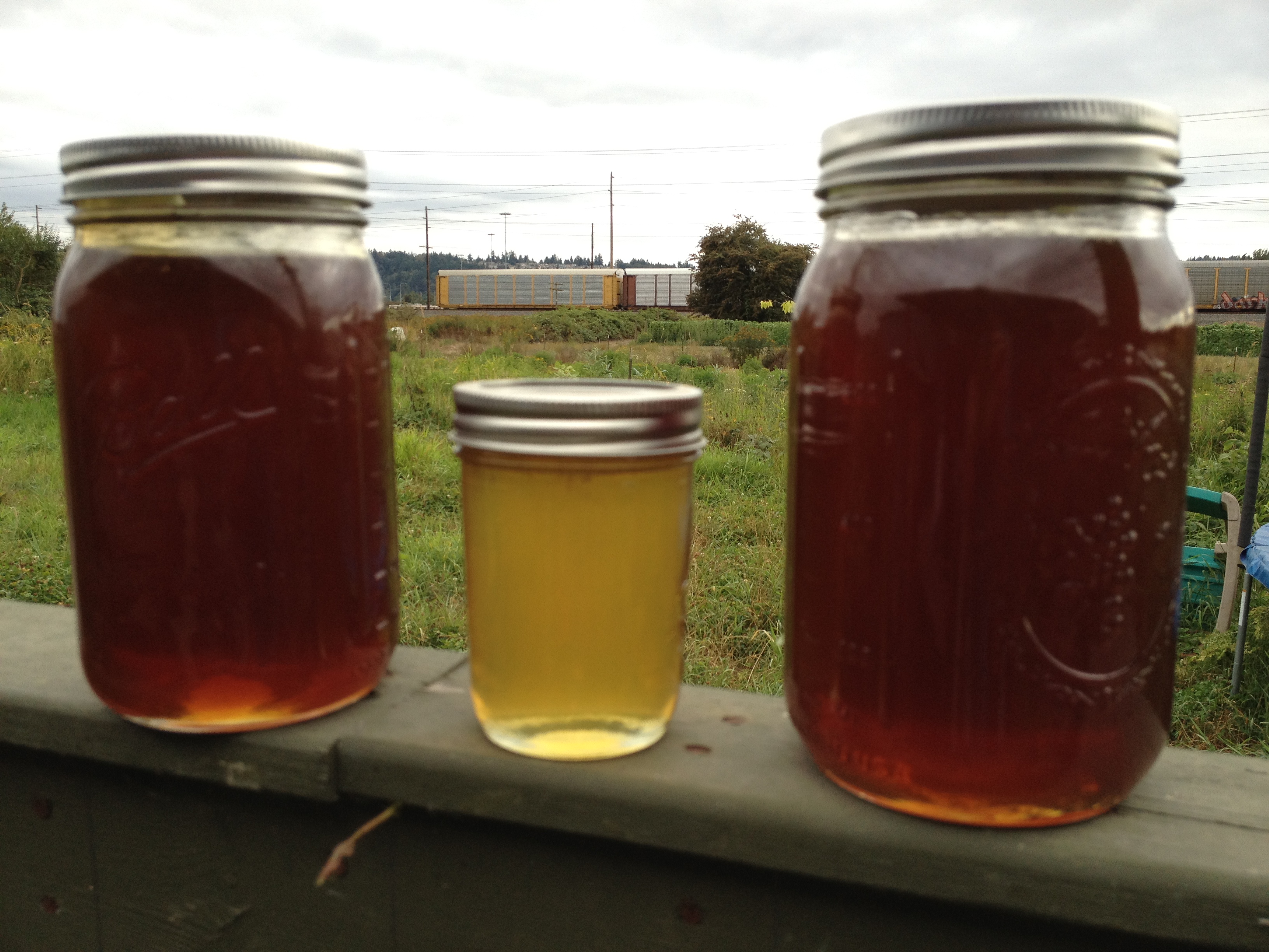 In 2012 we started out with local bees, from local beekeeper, David F. in Burien. They are dark and, well, not as friendly. However, they are hard workers, and they seem to be hardy. It is now January and we have three colonies that are still alive and come out to fly when it’s not raining. Even if it’s 40°. Again we got a small yield in 2012, not bad considering we lost all the queens in July.