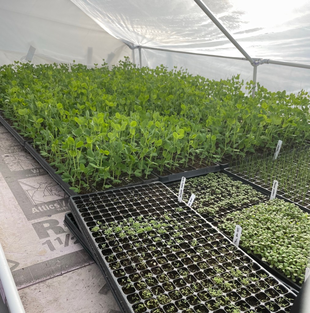 The days are getting longer, and the prop house is filling up! The garlic is growing tall outside, and the earliest weeds, our native cover crop, are blooming and ready to provide for the earliest pollinators. Up to now, I’ve only seen the honeybees out foraging, but the earliest queen bumblebees will emerge soon, and the willows will be ready to feed their bee children with protein-rich pollen.