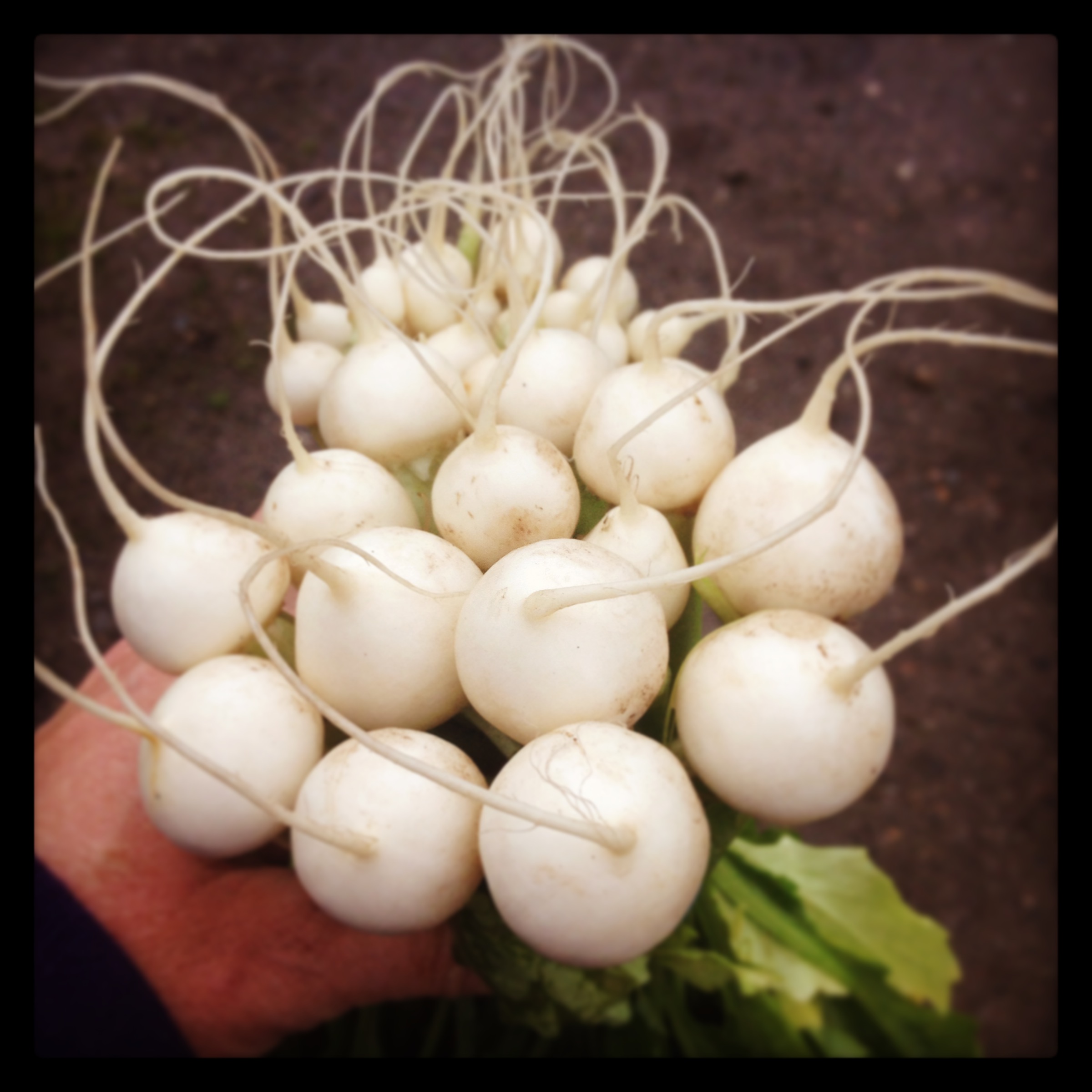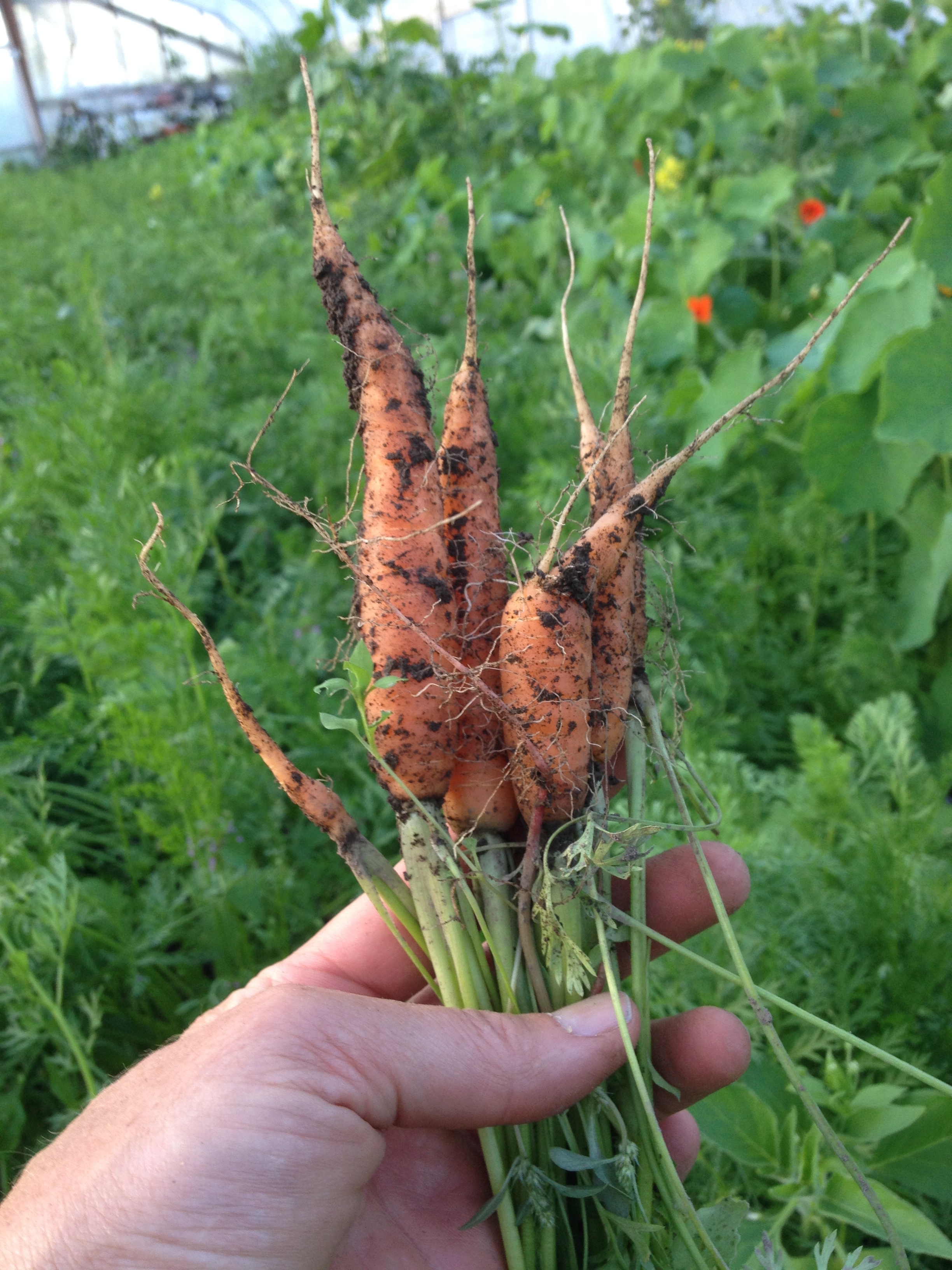 Good news is that the outdoor herbs (basils, parsley, cilantro, dill) are all doing great and we will be picking them soon. The carrots, beets, and turnips will be ready sooner than planned, and so will the broccoli and cabbage. Even the beans will be along in another week or two, and that is speedy! Our next (and larger) plot of peas will be ready next week, too, so you’ll be getting more crunchy sweetness.