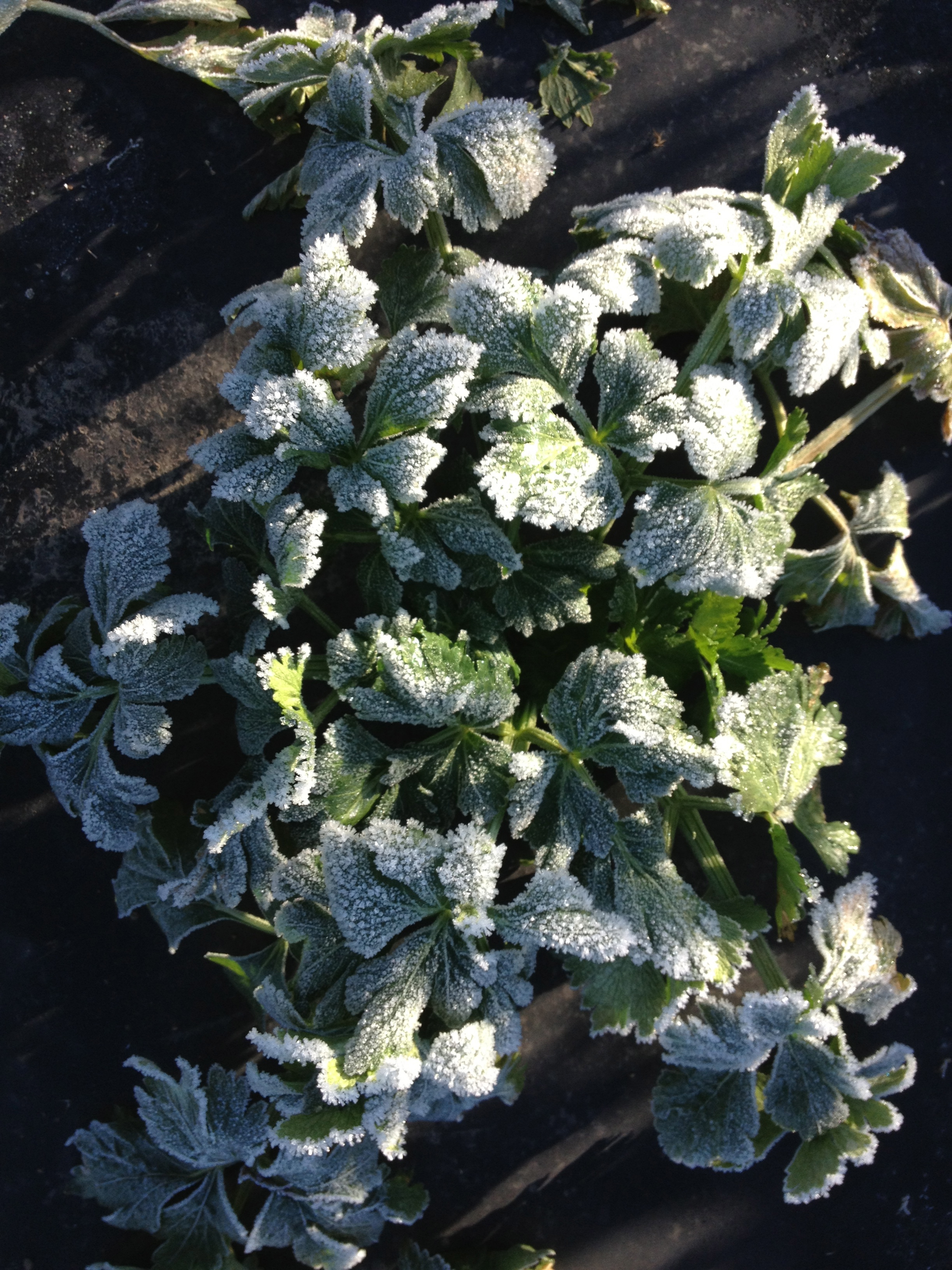 First hard frost of the season. This makes me really excited, because at long last the kale that people have thought tasted so good is now going to taste amazing! Frost converts the starches in the leaves to sugars—nature's antifreeze.