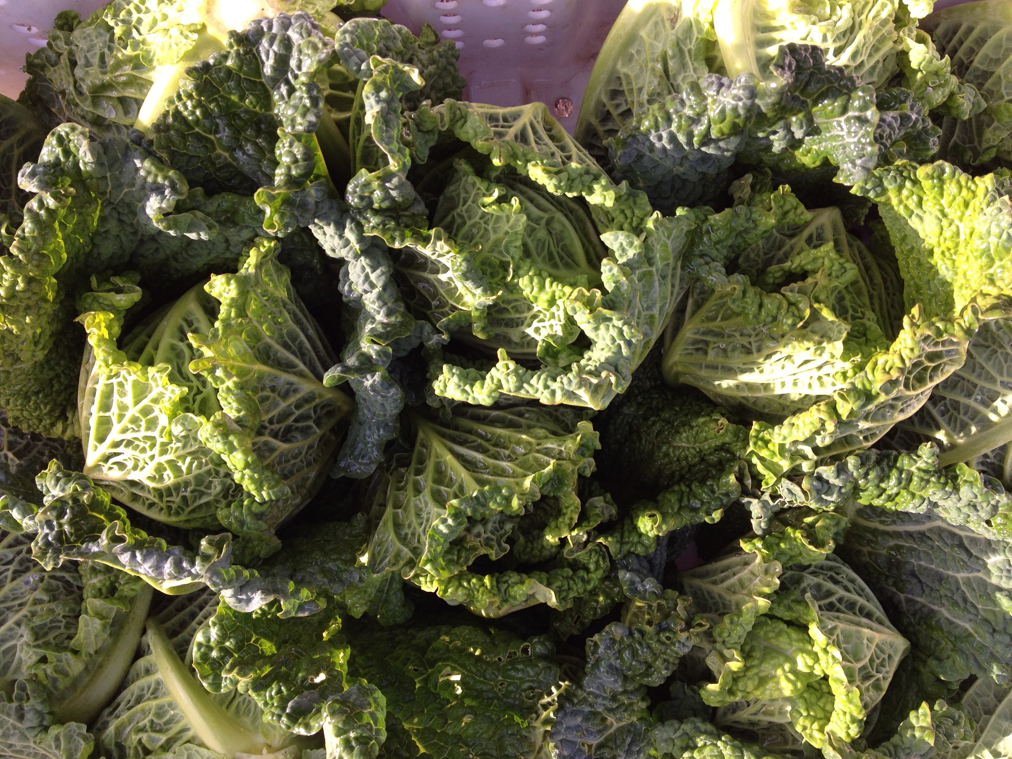 Tender little savoy cabbages are sweet and delicious shredded and eaten raw, or steamed or lightly sautéed in butter. We'll plant a few weeks earlier next year so they get bigger. Oops.