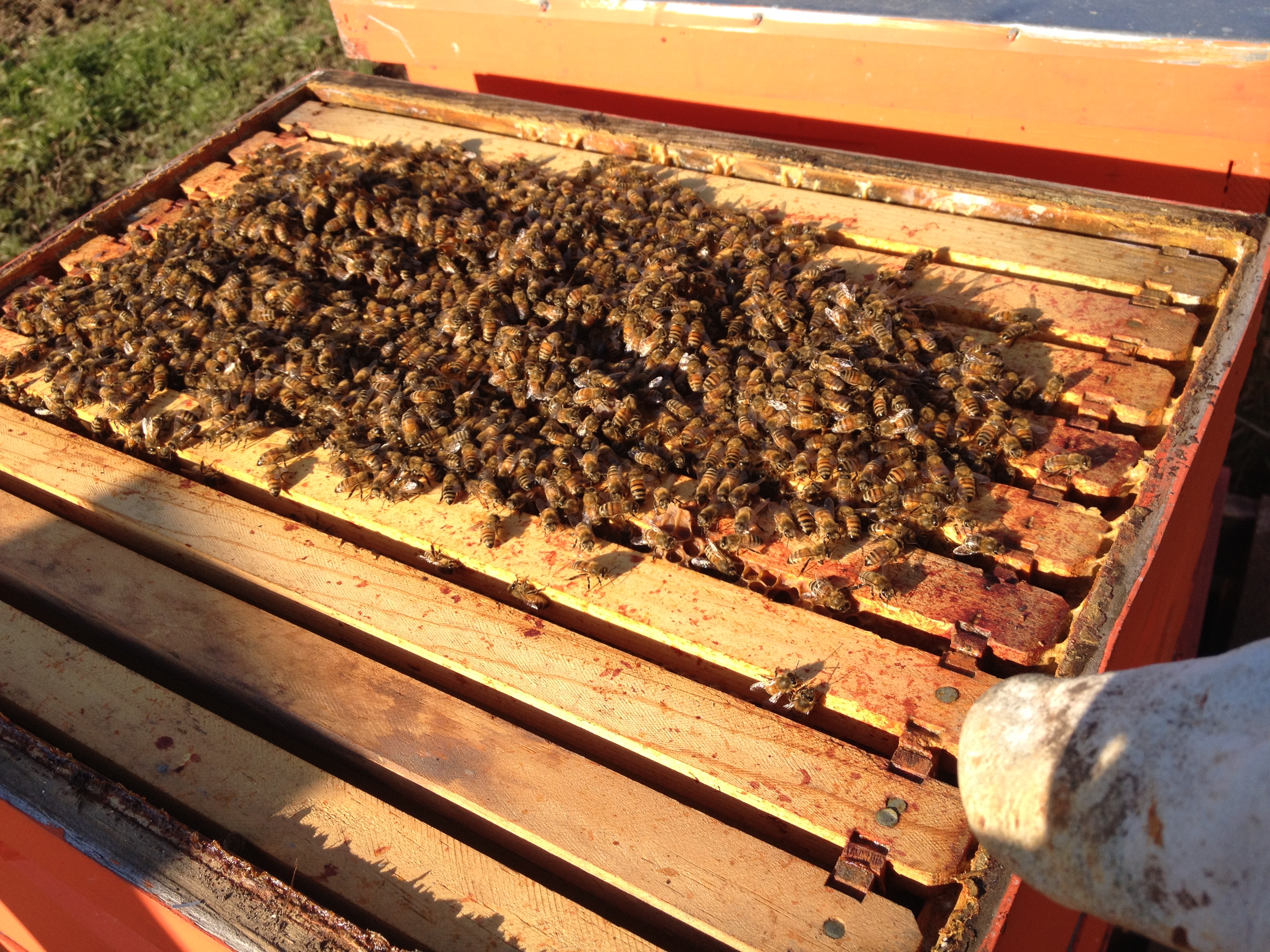 Last check-up of the bee hives before real winter. The goal is to squeeze them into the smallest space possible so they can keep themselves warm, while leaving them plenty of reserves to take care of brood in the early spring. Looks like we have three strong colonies now, but anything can happen through the long winter.