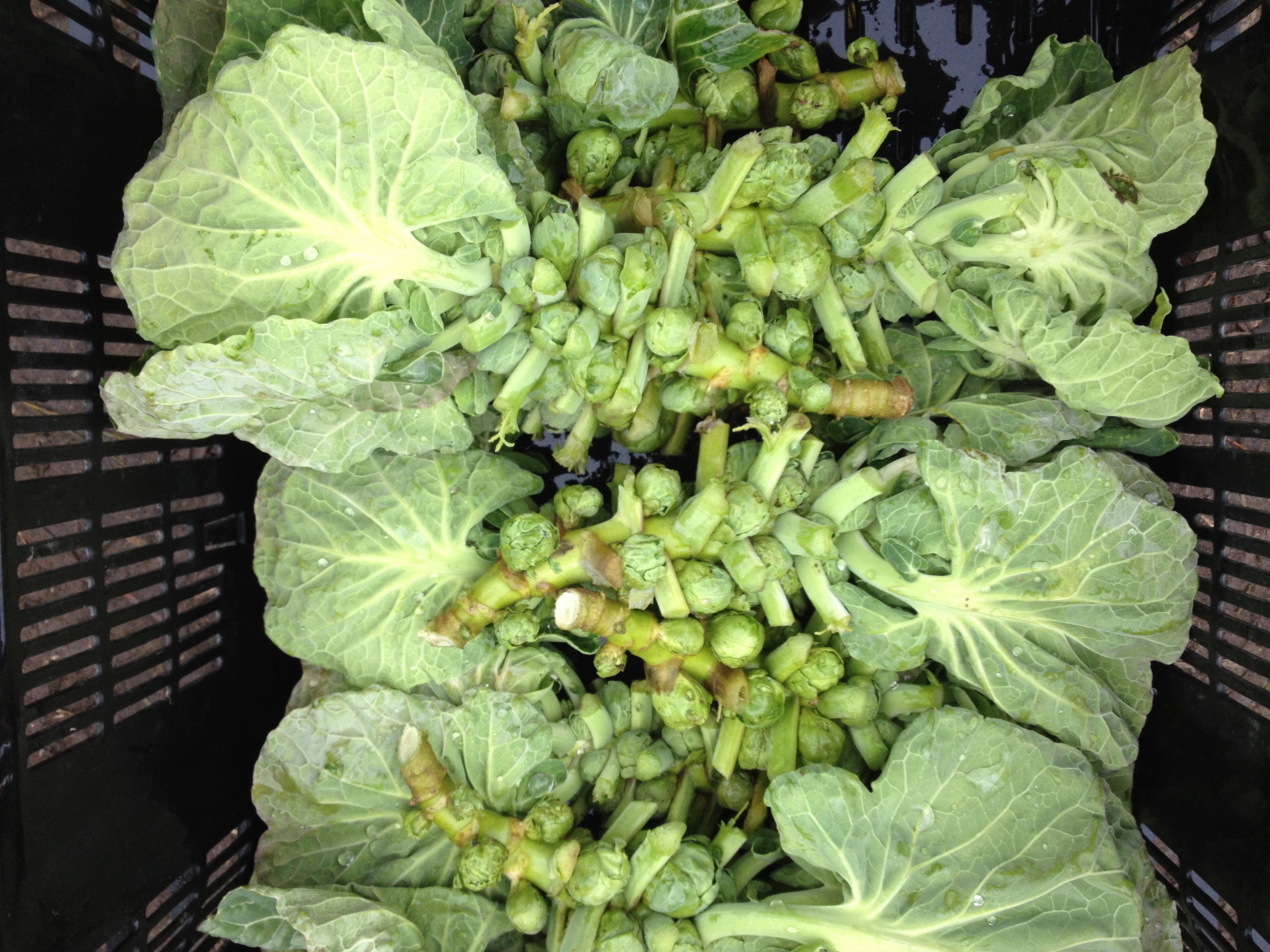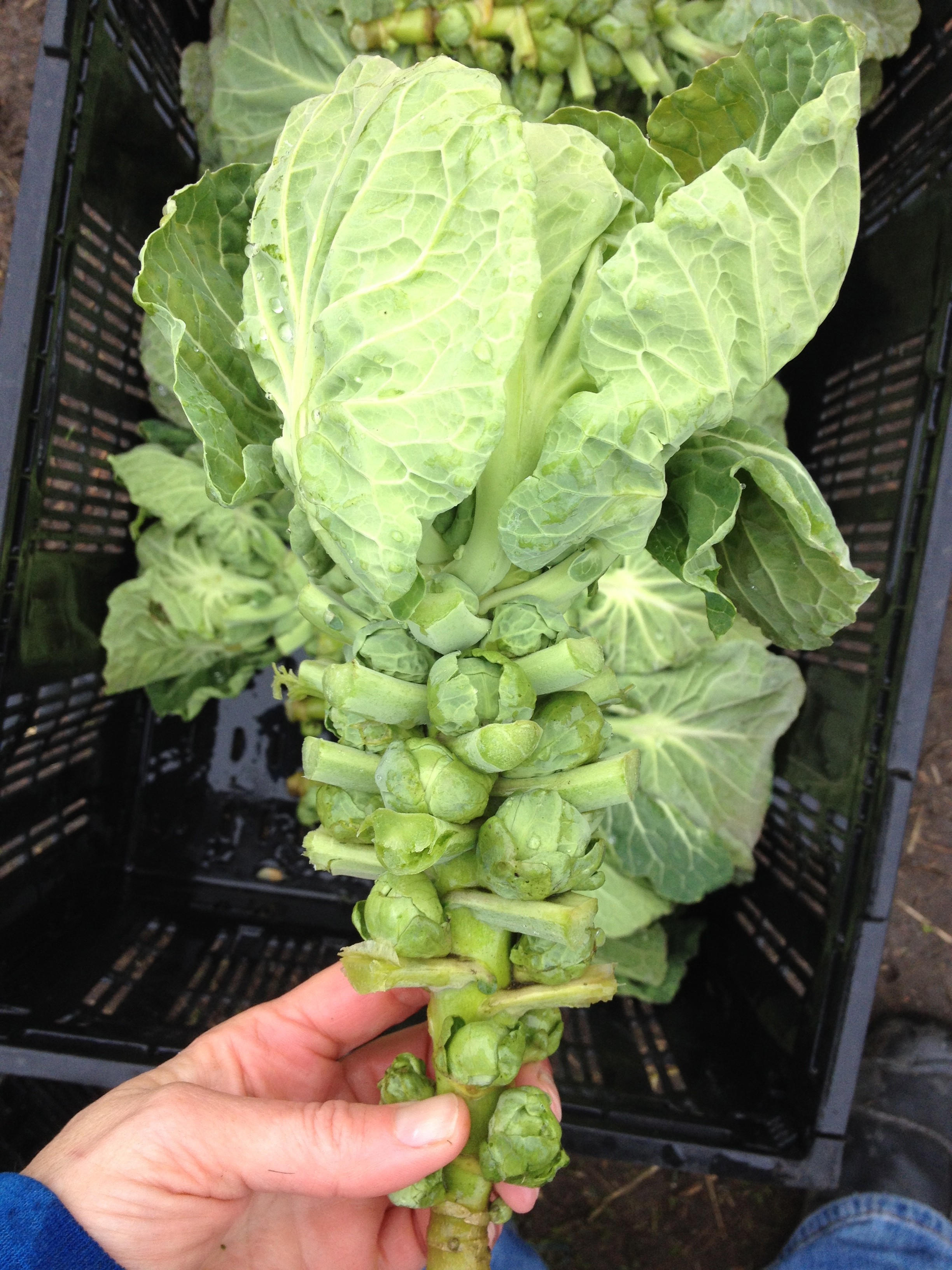 The brassica family is an interesting one, and a large one full of mutants-turned-new varieties. Brussels sprouts are basically just cabbages that stretched out in height and instead of growing a single, large head, started producing tiny heads in its leaf joints. No genetic modification, only selective breeding and natural mutation in the field. We hope to be harvesting ours for you after the holidays.