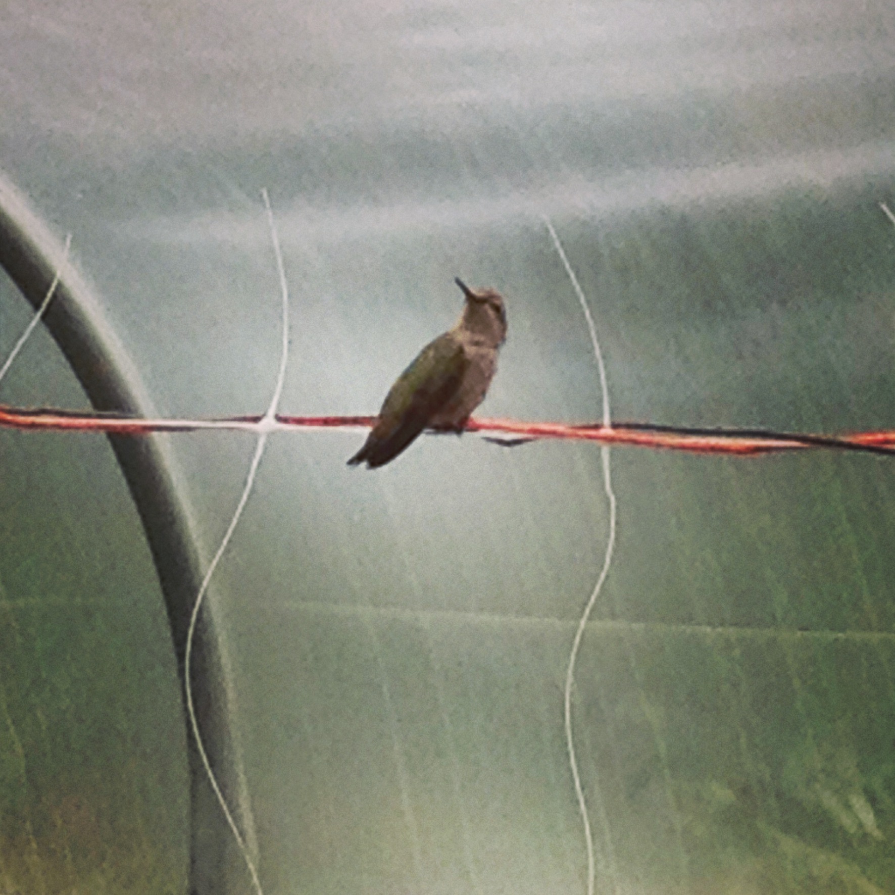And here’s a nice moment captured in the greenhouse. This little female Anna’s Hummingbird spends a lot of time with the cucumbers and nasturtiums. She chirps at me while I’m working in there, but doesn’t leave. I’ve been able to overwinter a little group of them for three years now, with careful feeder maintenance. I wonder which generation she is.